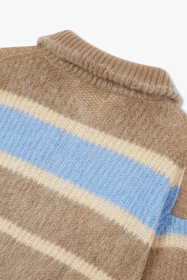 大きめの配色ストライプパターンが調和し、一層カジュアルなルックに仕上げます。