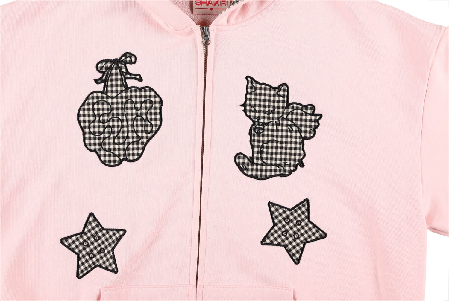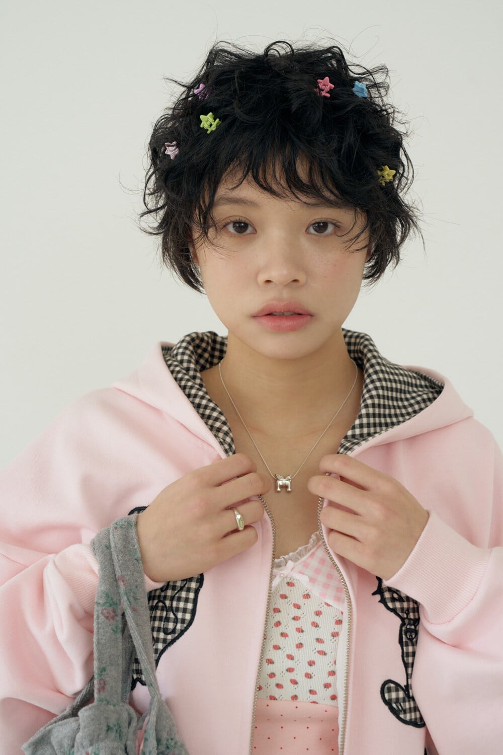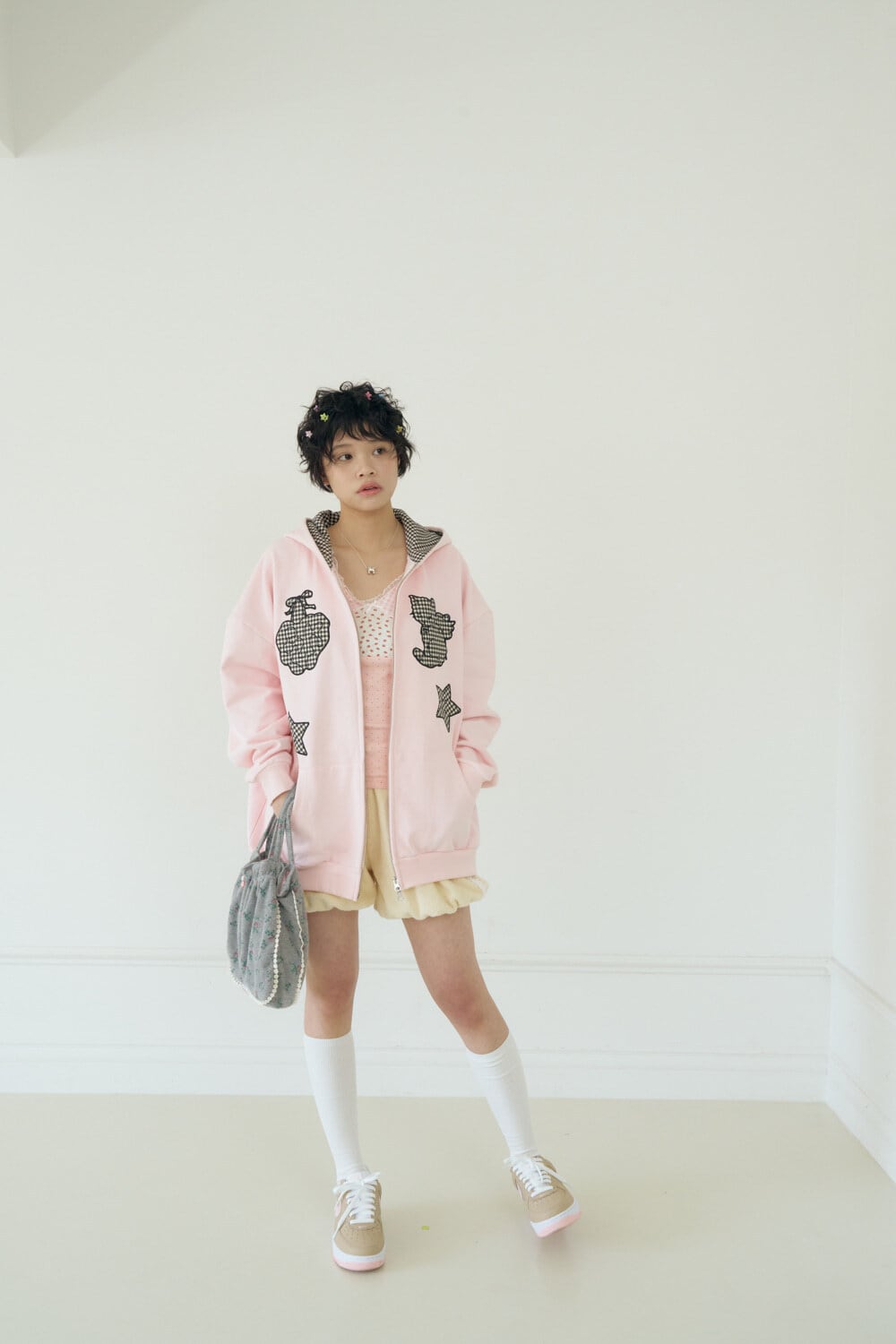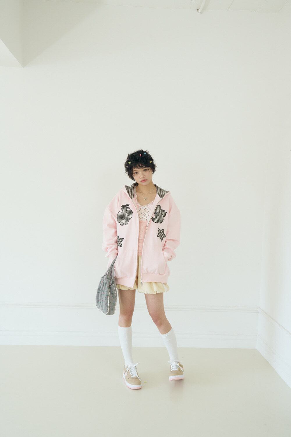 チェックパッチオーバーフィットパーカージップアップです。キッチュなシャキリシーズンモチーフでギンガムチェックパッチが前面部に飾られています。