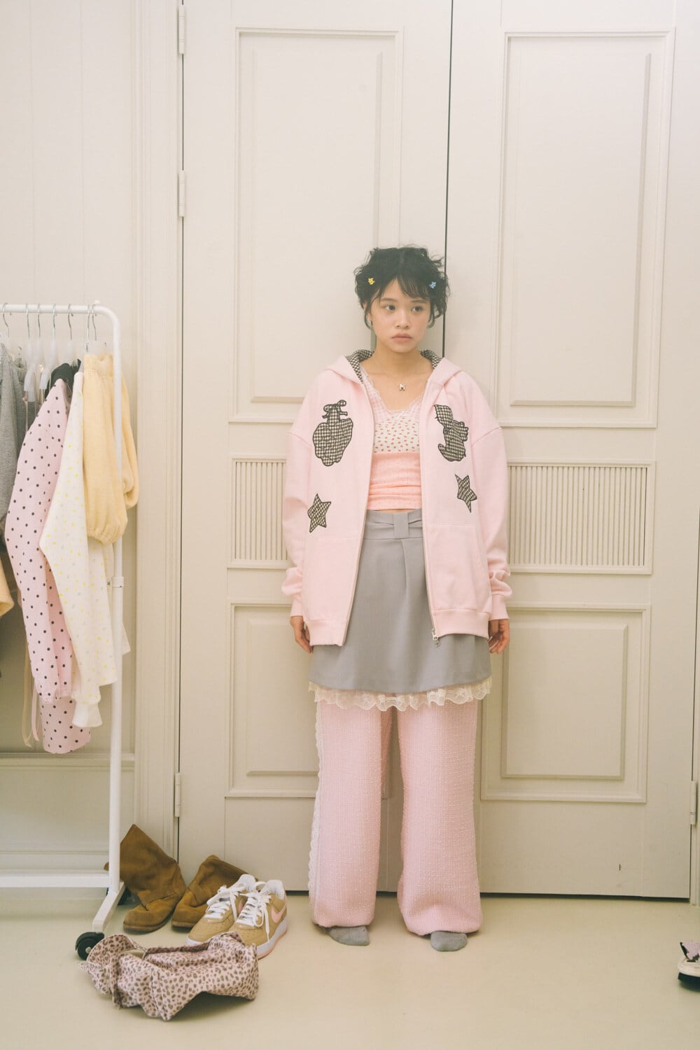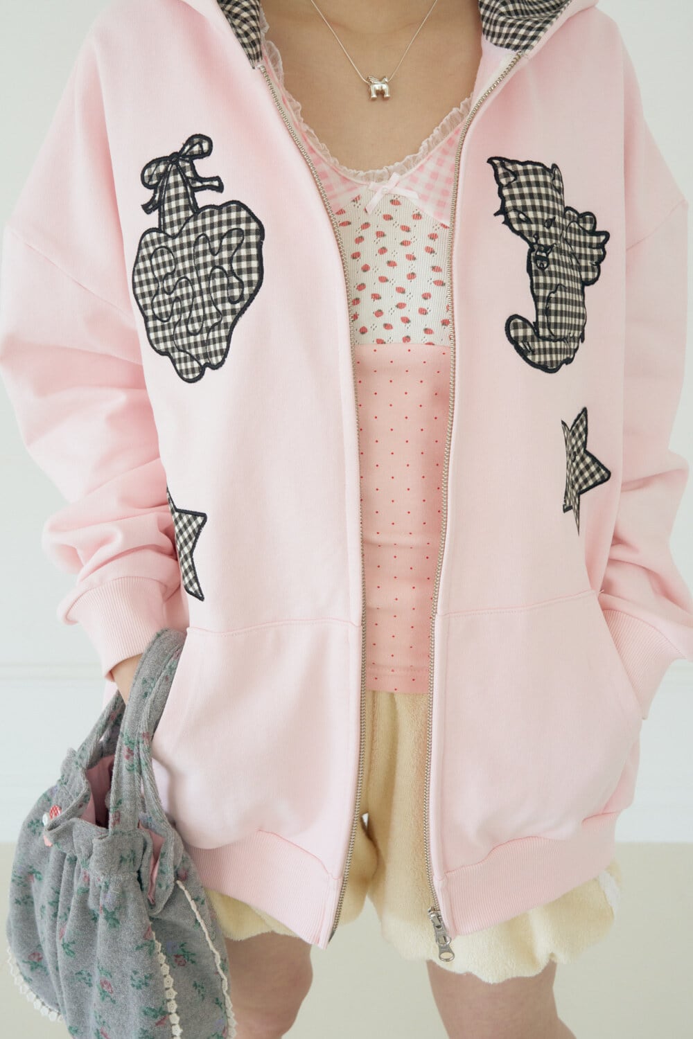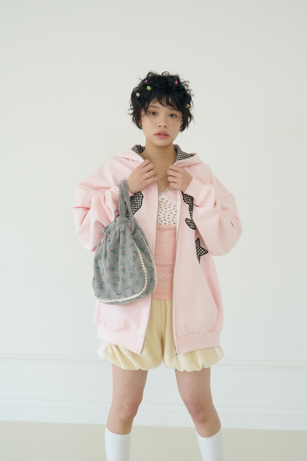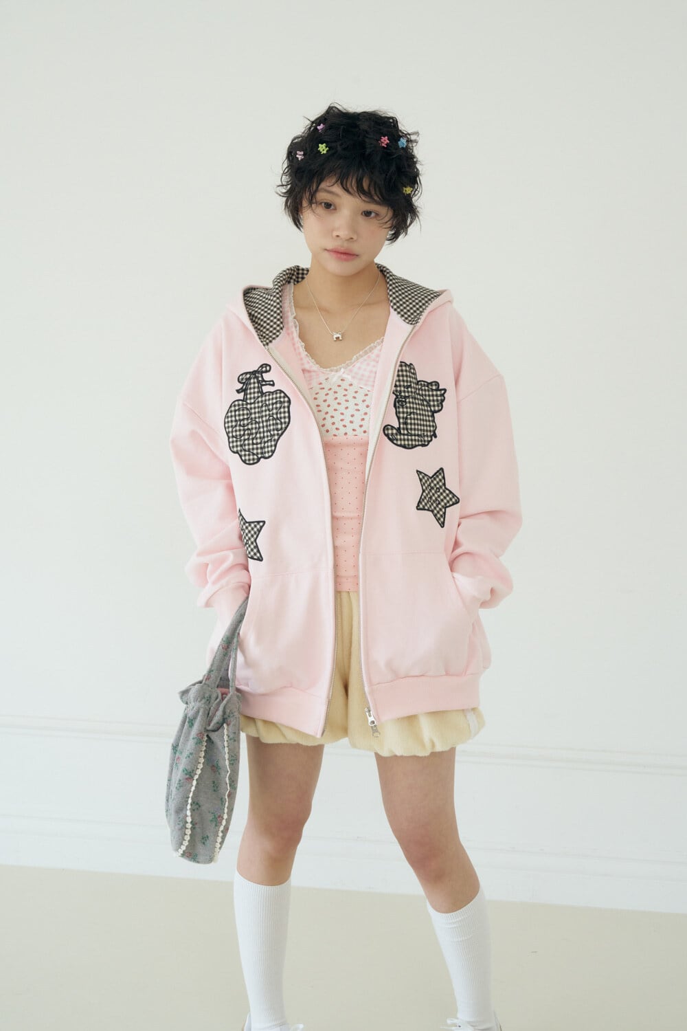 チェックパッチオーバーフィットパーカージップアップです。キッチュなシャキリシーズンモチーフでギンガムチェックパッチが前面部に飾られています。