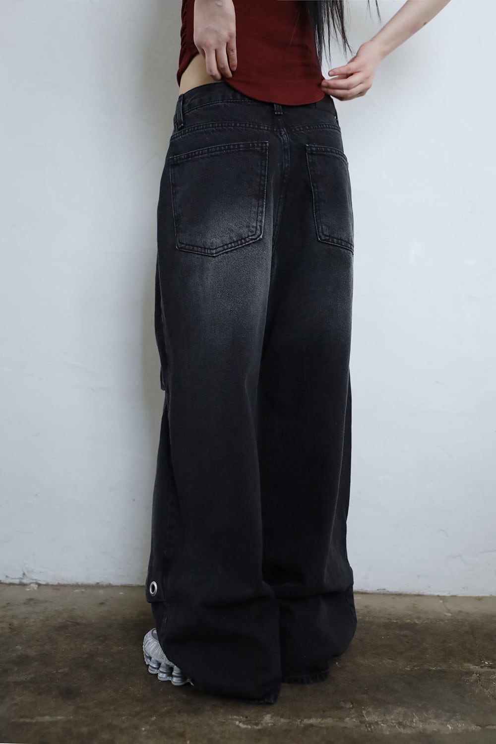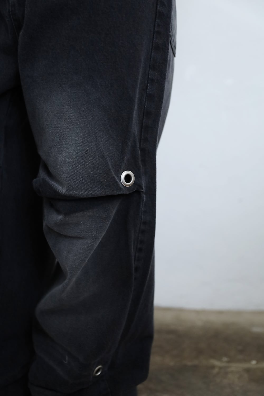 サイドピンタックとアイレットディテールの黒青デニムパンツです。