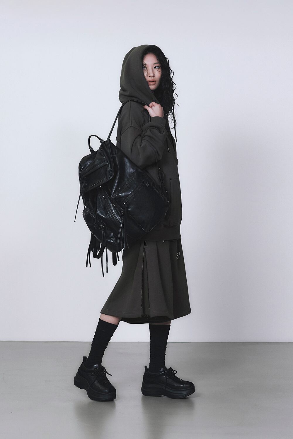 - センターとサイドファスナークロージングでアウトフィット変形が可能なフーディージップアップ