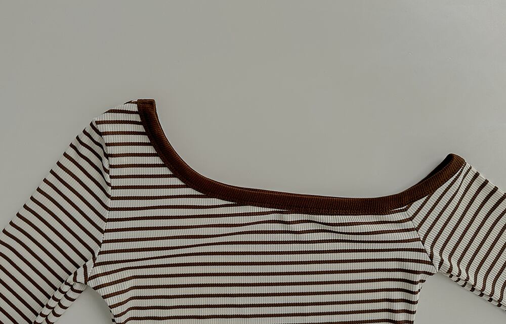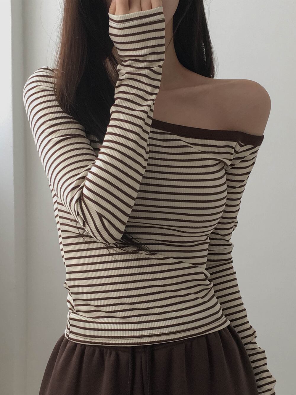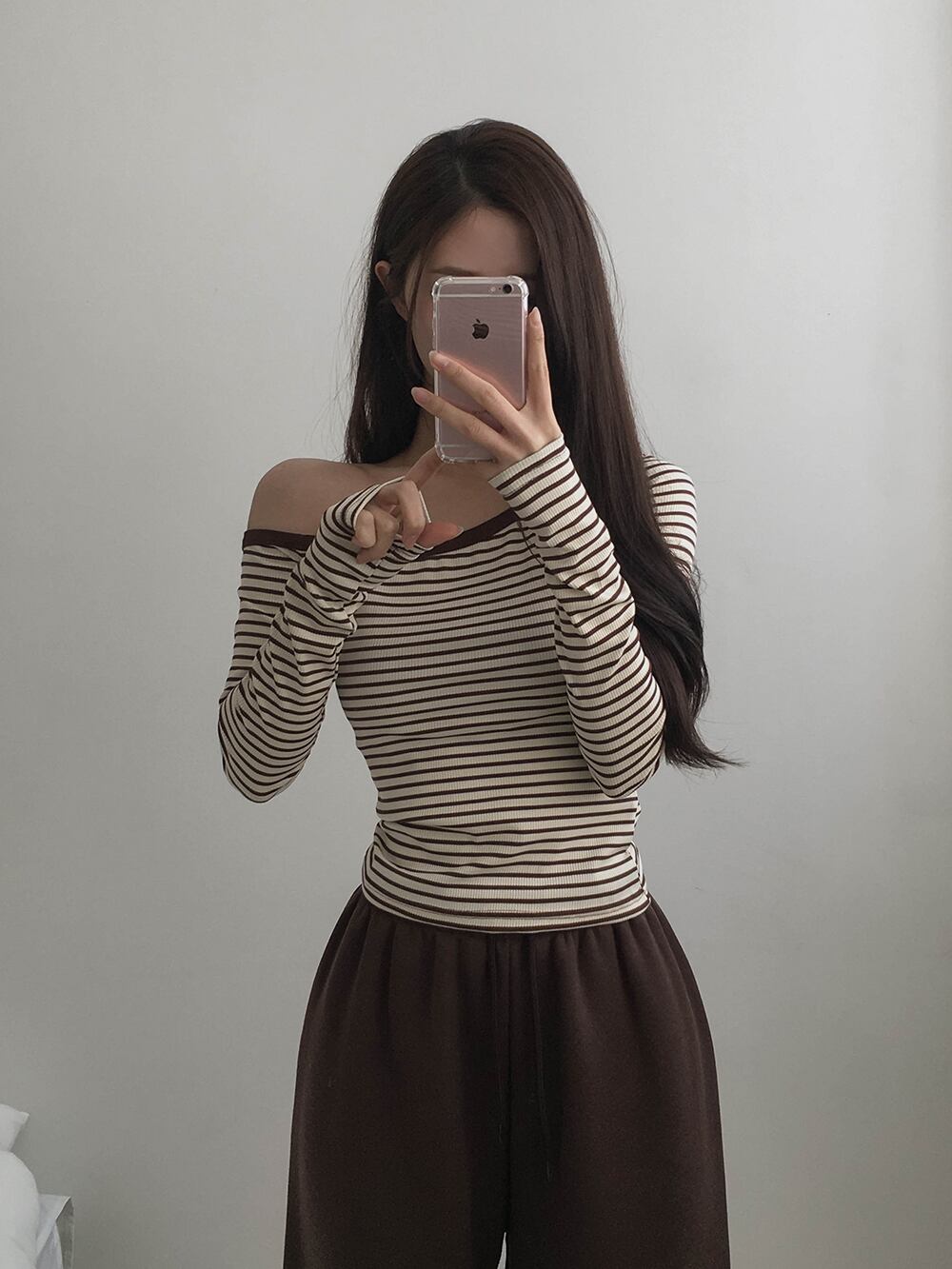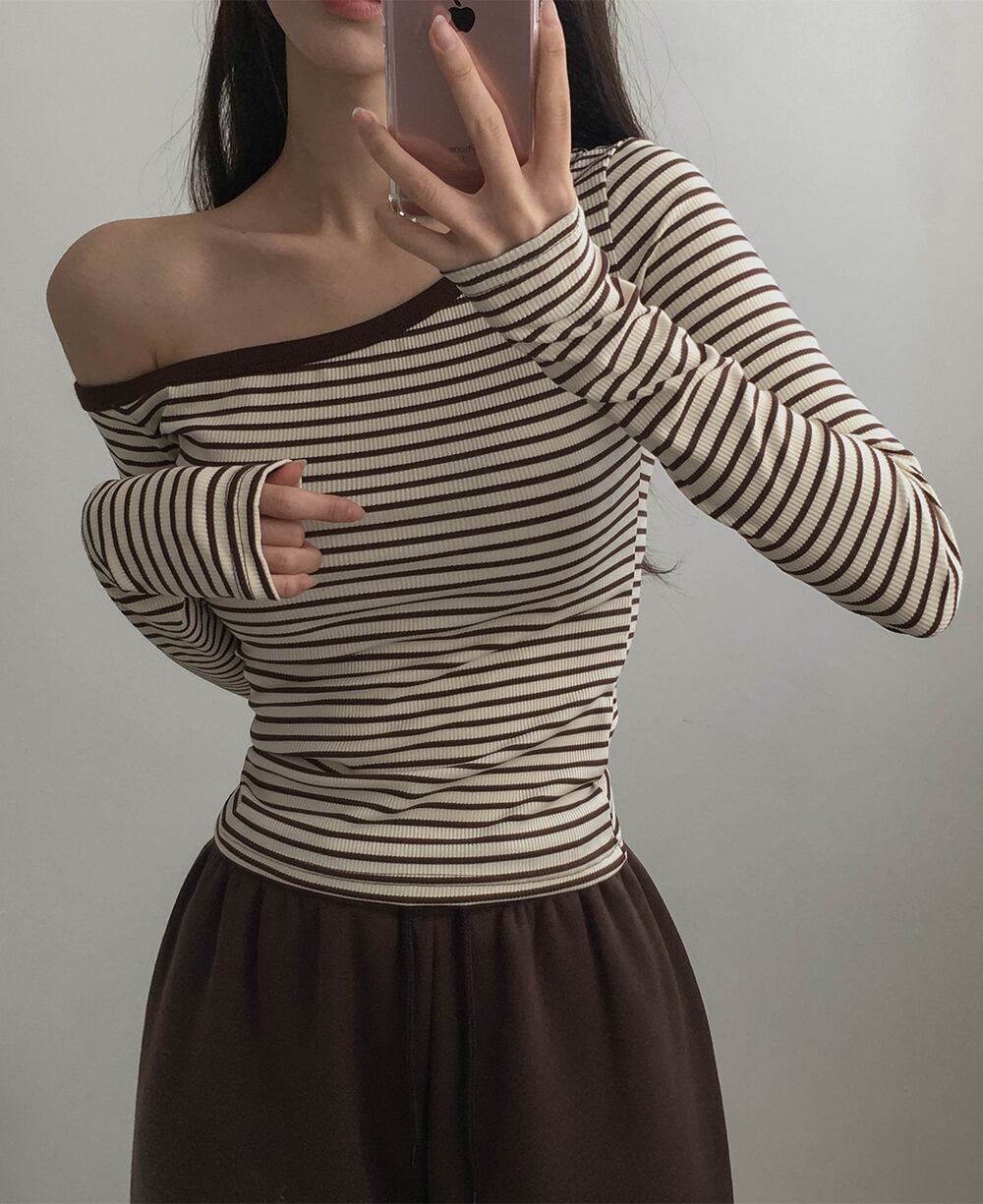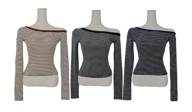★Hearts2Heart ジウ 着用!!【MORE FIT】Darby Unbalanced Off-Shoulder Dangara Stripe Long-Sleeved T-Shirt 3 colors