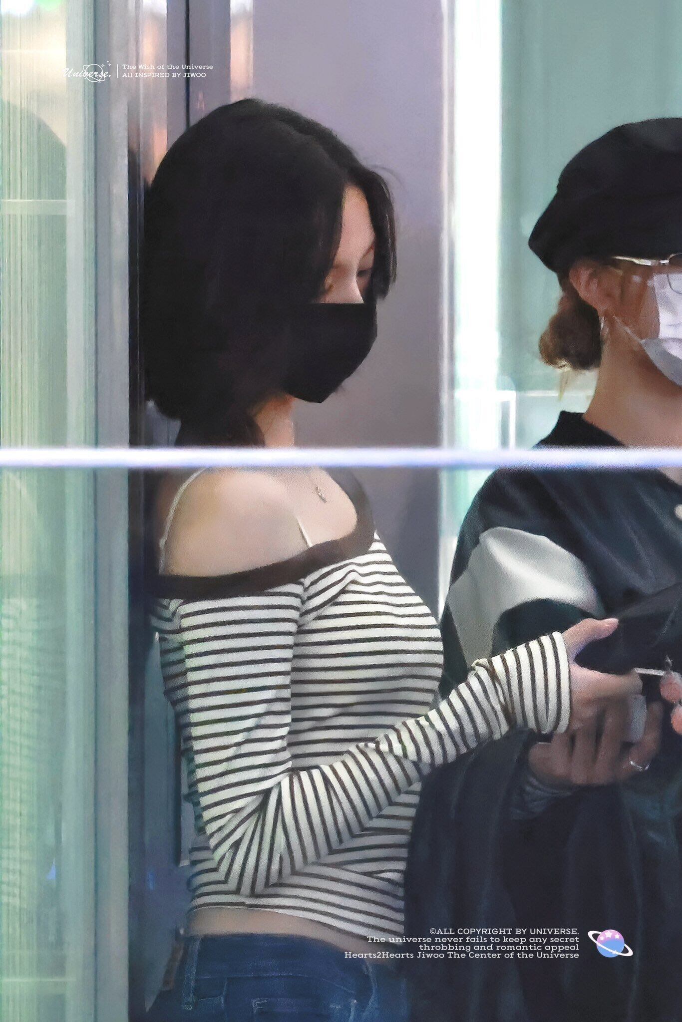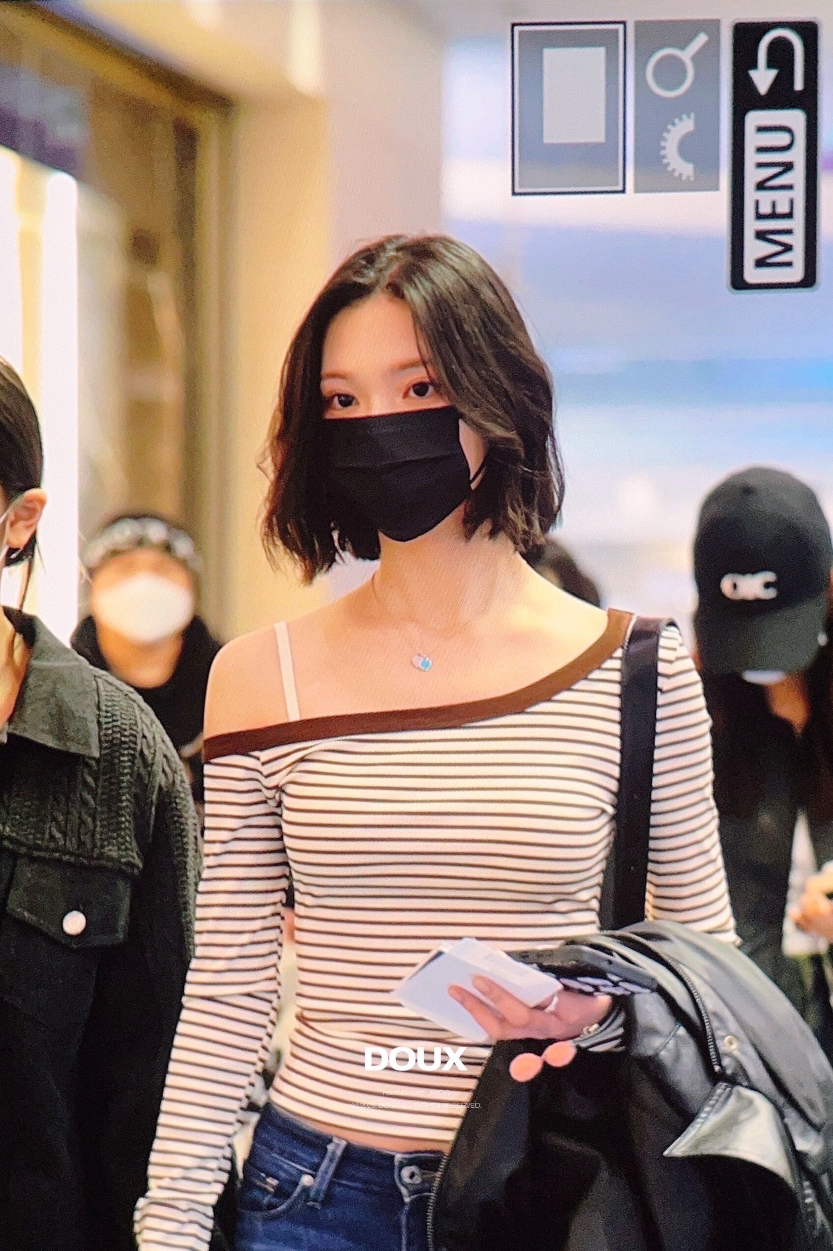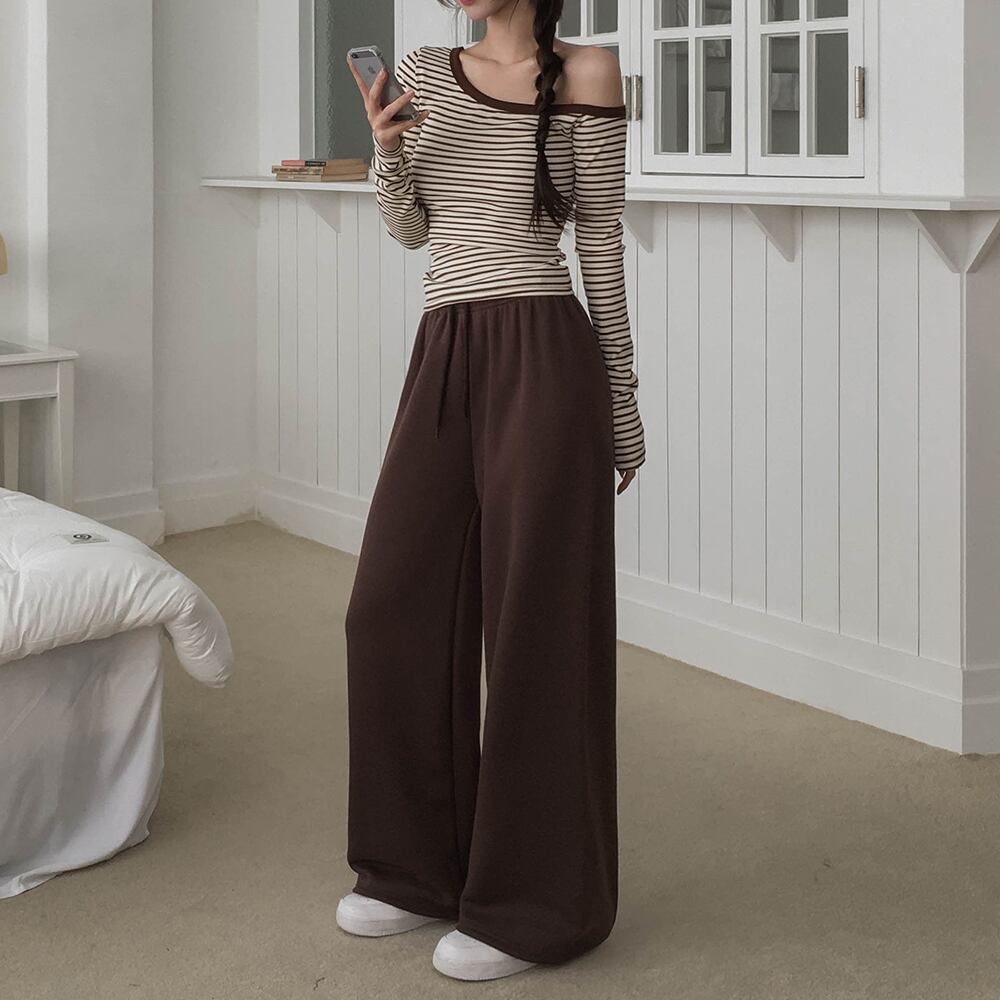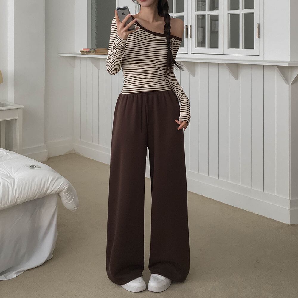★Hearts2Heart ジウ 着用!!【MORE FIT】Darby Unbalanced Off-Shoulder Dangara Stripe Long-Sleeved T-Shirt 3 colors