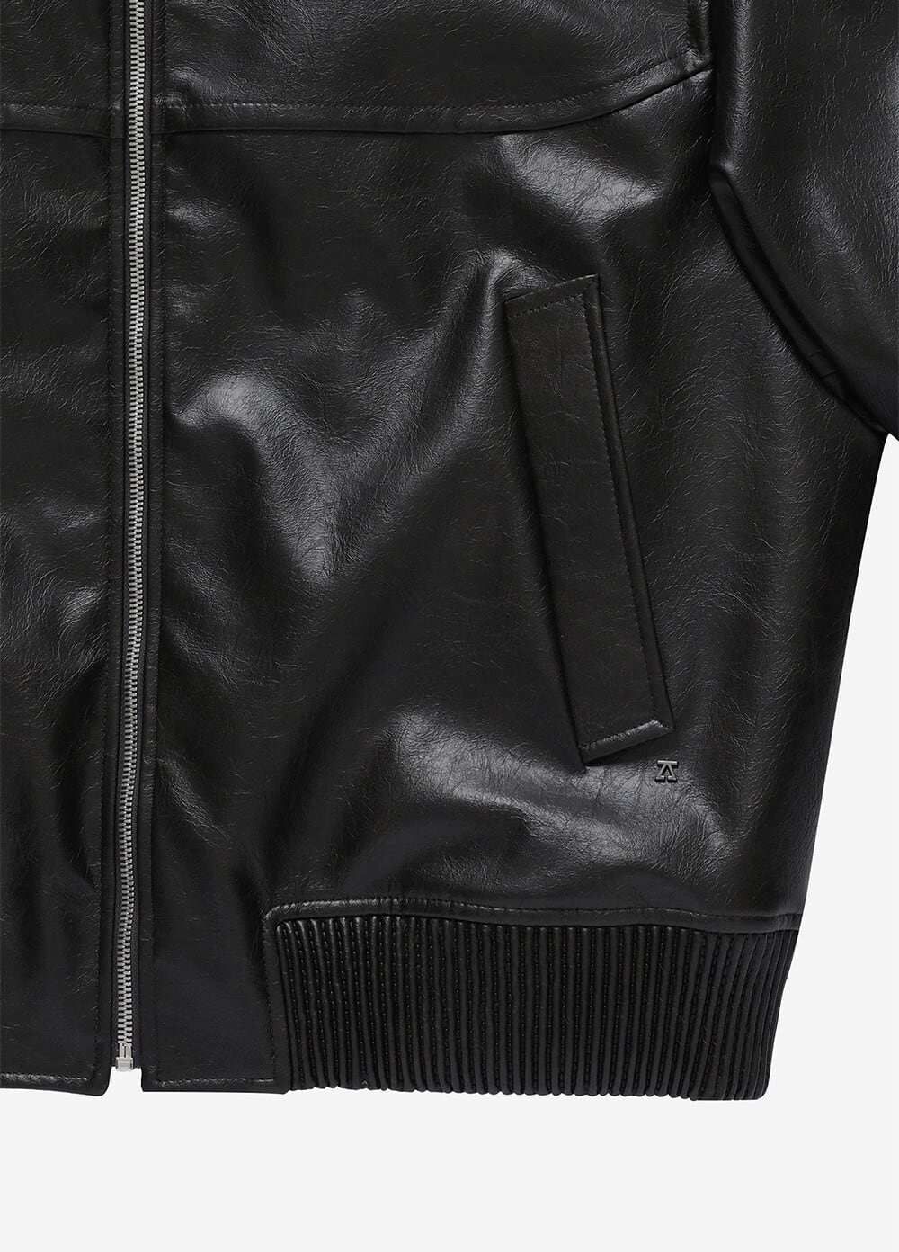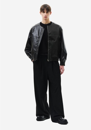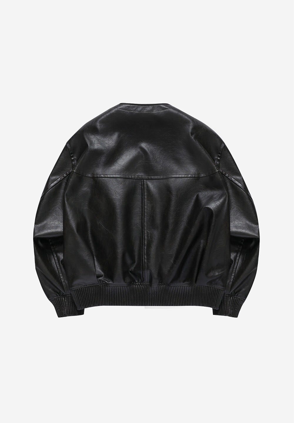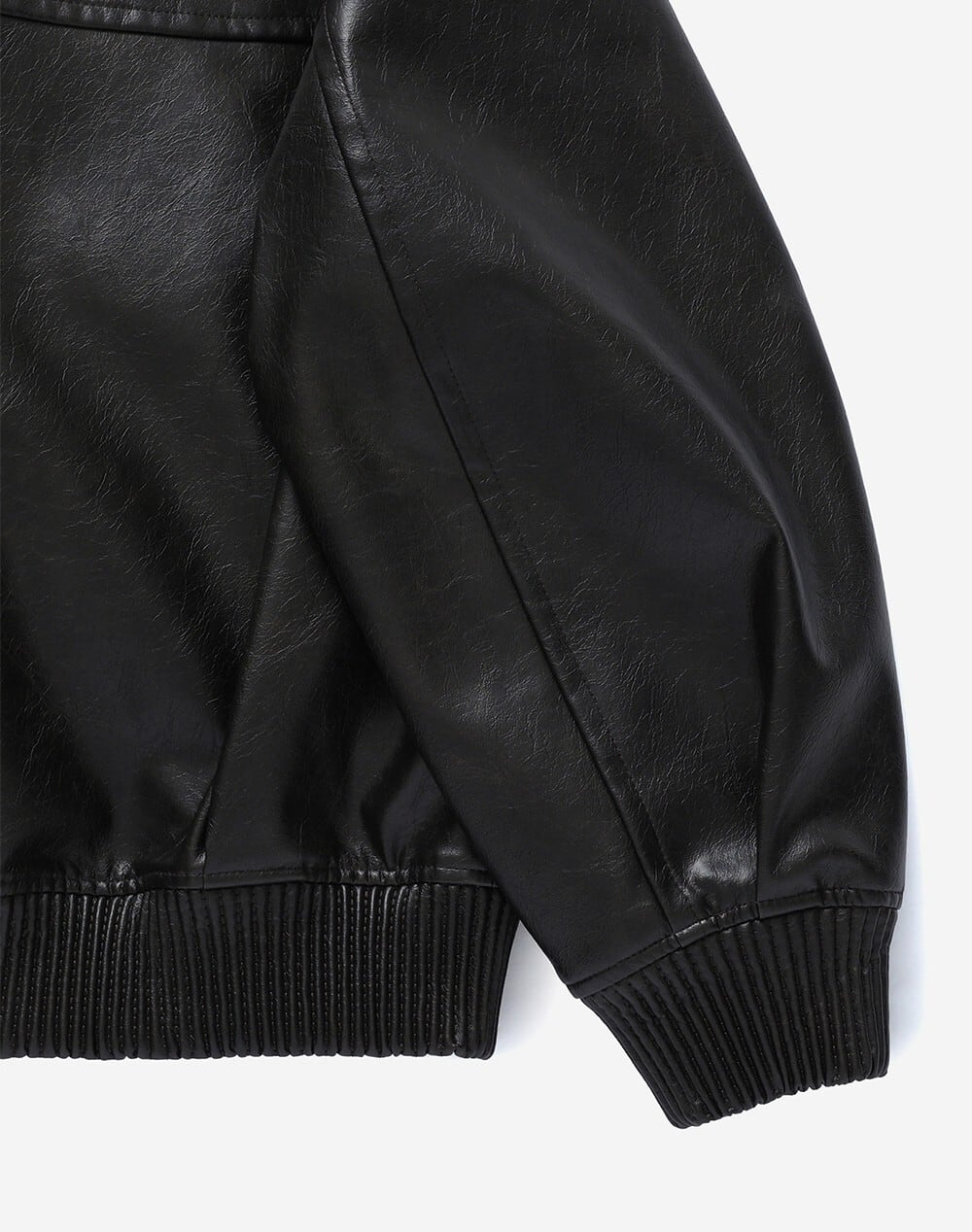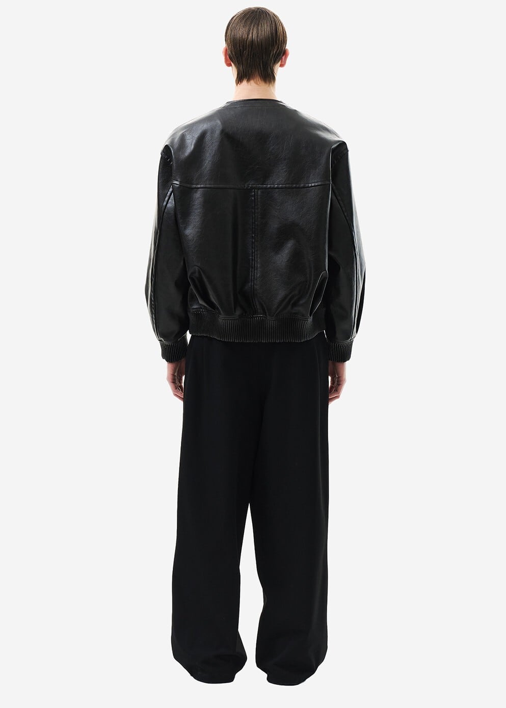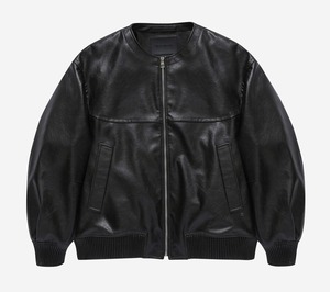 クラッキング加工されたビンテージ調の人工レザー素材を使用し、タックでボリューム感のあるカラリススタイルを演出。