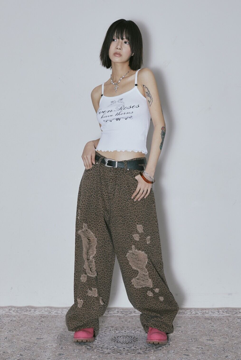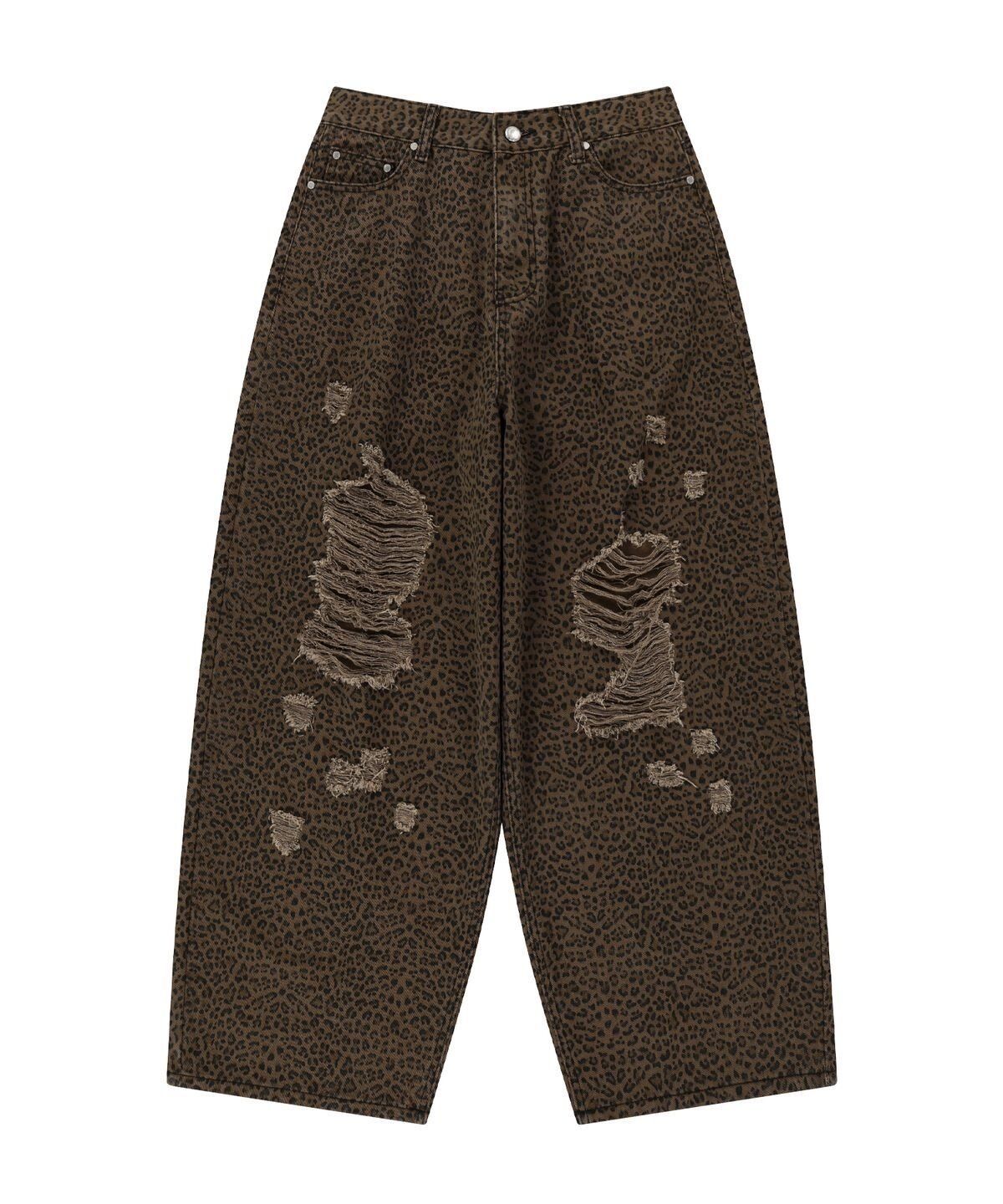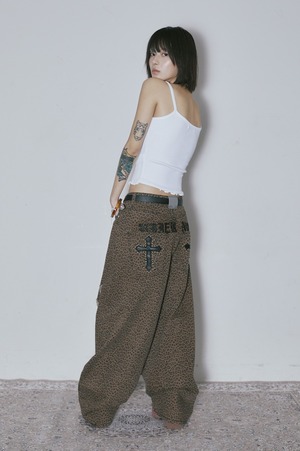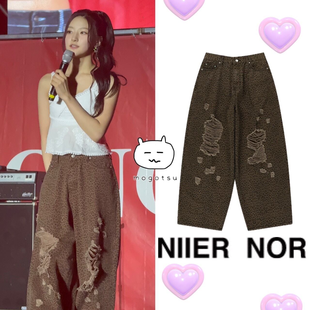 在庫少なめ!!★KISS OF LIFE ハヌル 着用!!【NIIER NOR】BACK-CROSS DAMAGED WIDE PANTS_LEOPARD