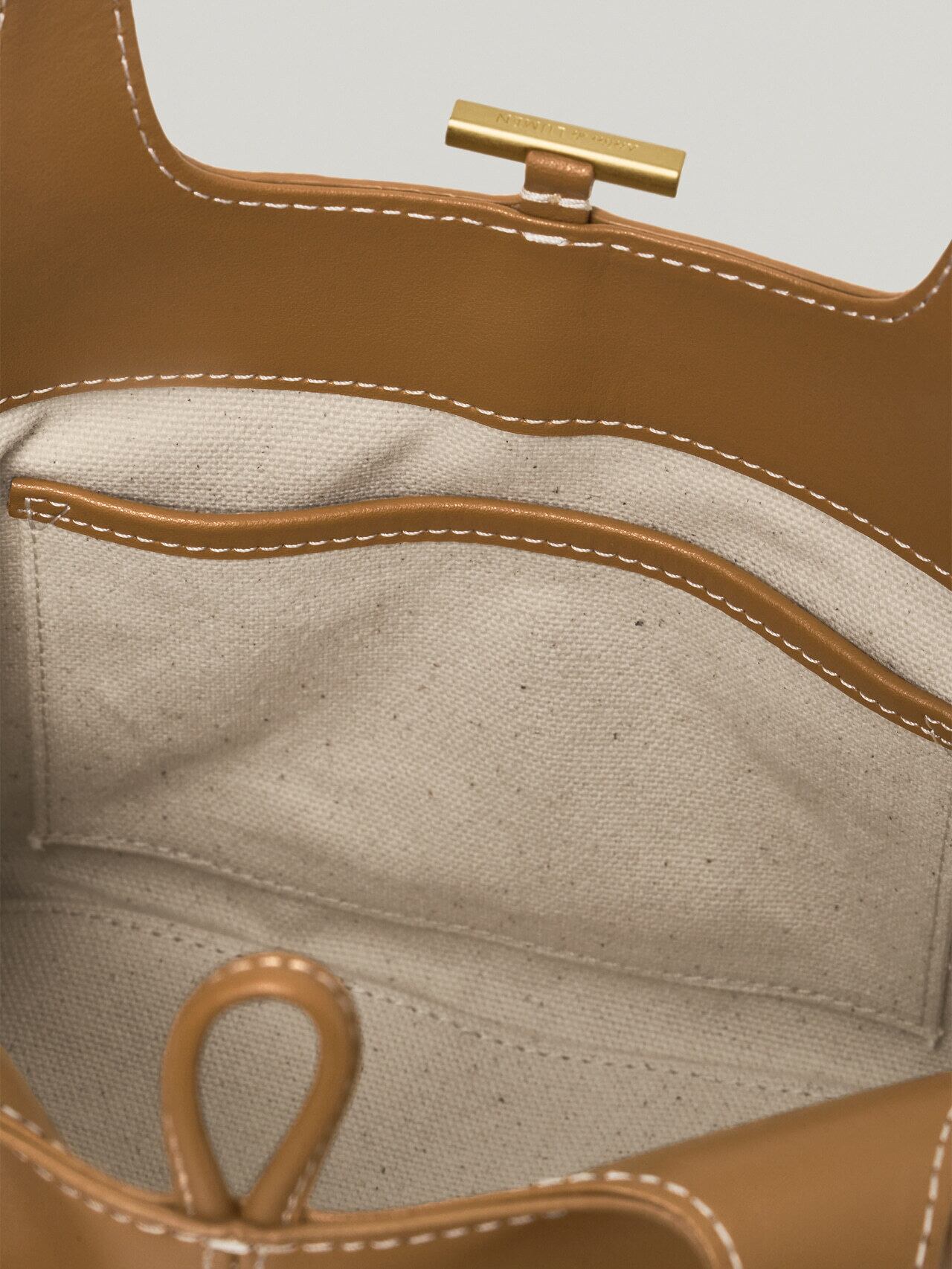 革にぎっしりと置かれたステッチが調和して小さなかごの形に似たパニエフティ(Panier petit)バッグです。 背面の革の輪を利用して開閉する構造で、前面のほのかなゴールド装飾にはアトリエドルーメンのロゴが刻まれており、クラシックさを加えました。 内部の前後にオープンポケットとファスナーポケットがあり実用的な収納が可能です。 こじんまりと手に巻くトップハンドルで、日常のどんな服装にもよく似合う製品です。