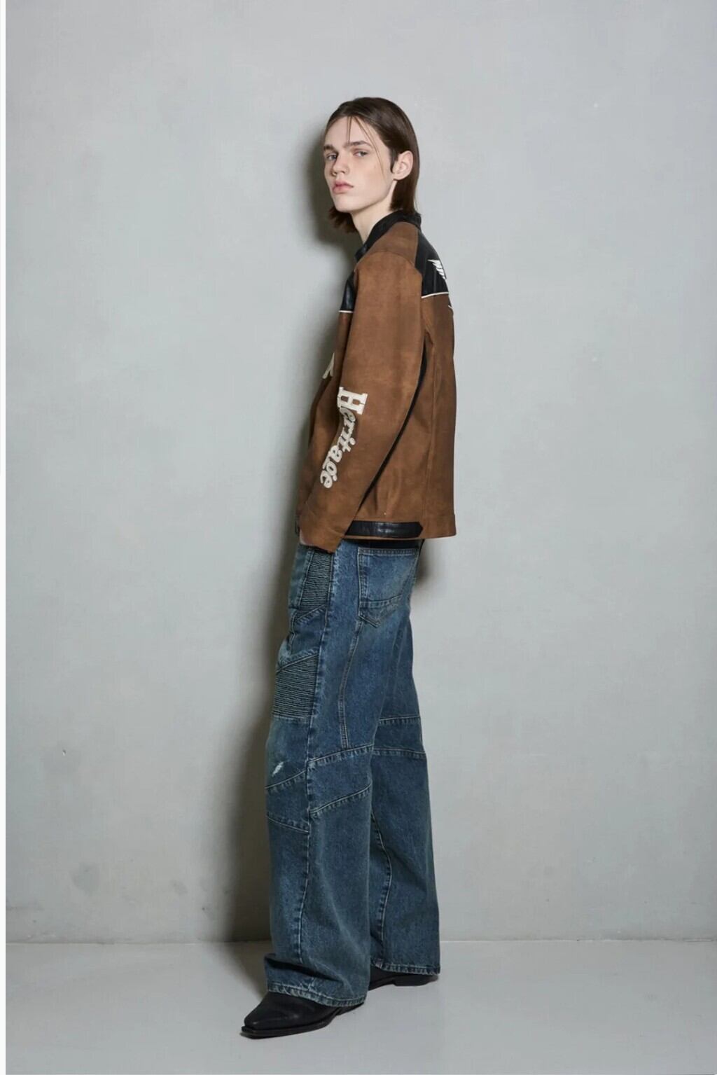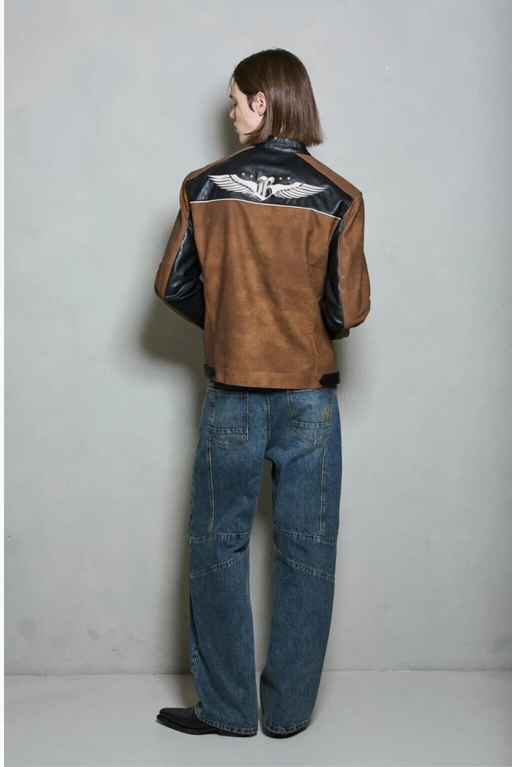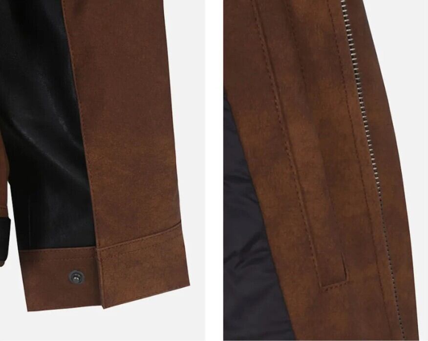 フェイクレザーとスエード素材を配色で使用し、落ち着いたルックにアクセントを加えやすいデザインです。