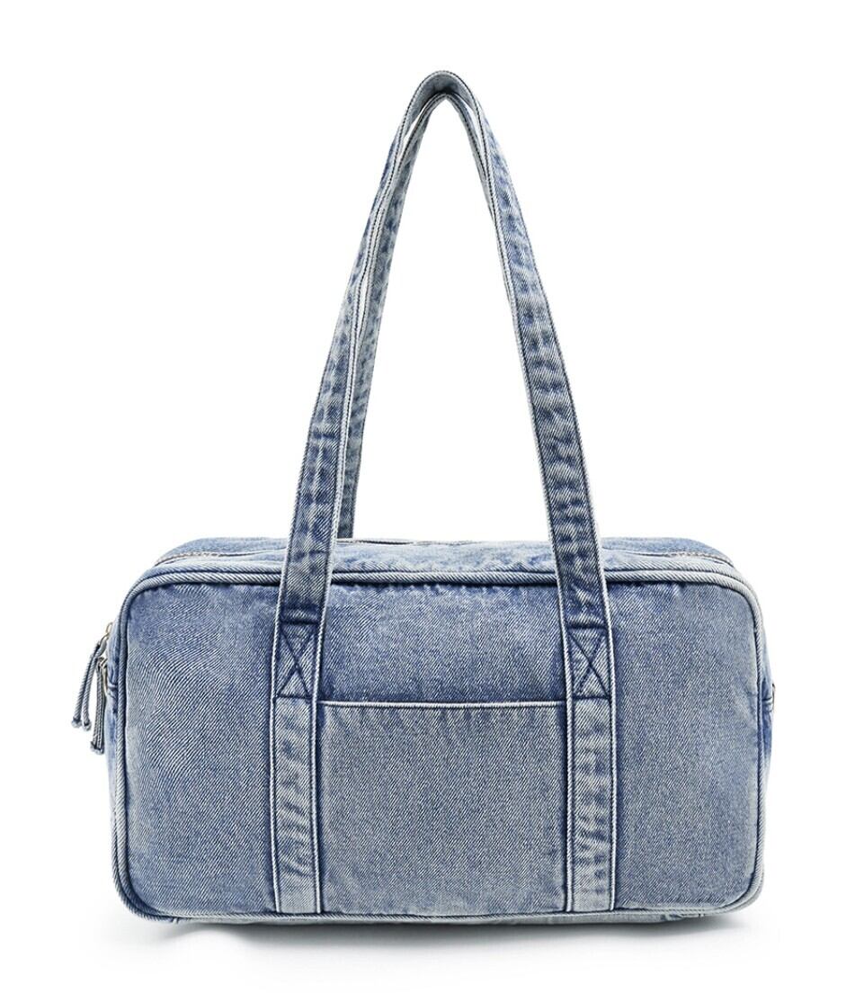 シグネチャーロゴと金属装飾、ステッチラインでポイントを加えたデニムダッフルバッグ。