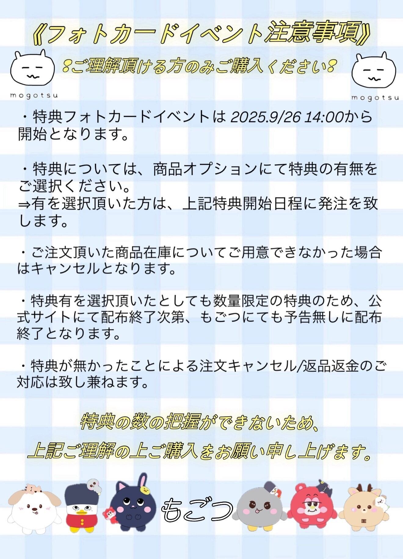 《フォトカードイベント注意事項》 ❢ご理解頂ける方のみご購入ください❢ ・特典フォトカードイベントは 2025.9/26 14:00から開始となります。 ・特典については、商品オプションにて特典の有無をご選択ください。 ⇒有を選択頂いた方は、上記特典開始日程に発注を致します。 ・ご注文頂いた商品在庫についてご用意できなかった場合はキャンセルとなります。 ・特典有を選択頂いたとしても数量限定の特典のため、公式サイトにて配布終了次第、もごつにても予告無しに配布終了となります。 ・特典が無かったことによる注文キャンセル/返品返金のご対応は致し兼ねます。 特典の数の把握ができないため、上記ご理解の上ご購入をお願い申し上げます。 もごつは常に最善を尽くし、できる限りお求めやすい価格でご提供できるよう努めております。他のショップでよりお安く販売されている場合は、ぜひご連絡ください。可能な限り価格に反映させていただきます。 当店では主に韓国ブランドの商品を取り扱っておりますが、本国でセールが行われるタイミングと当サイトの価格に差が生じる場合がございます。また、為替レートの変動により価格が上下することもございます。その点を何卒ご理解いただけますと幸いです。 なお、すべての商品は関税無料でお届けしておりますので、追加費用の心配はございません。安心してご利用くださいませ。