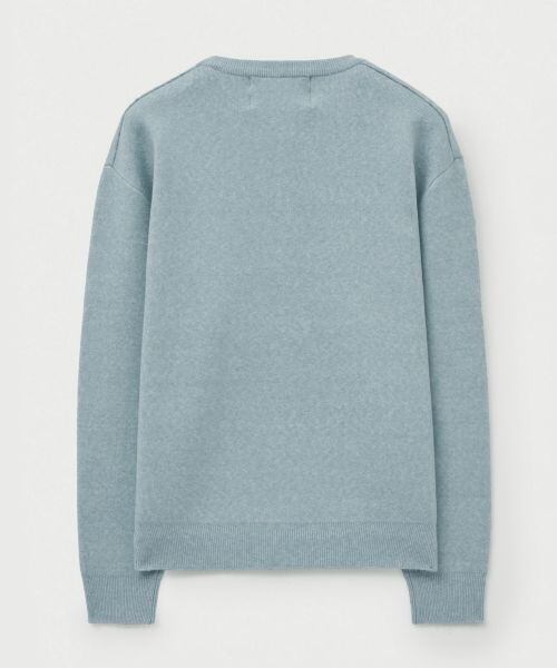 クラシックなムードのセミルーズフィット クルーネックプルオーバーニット。