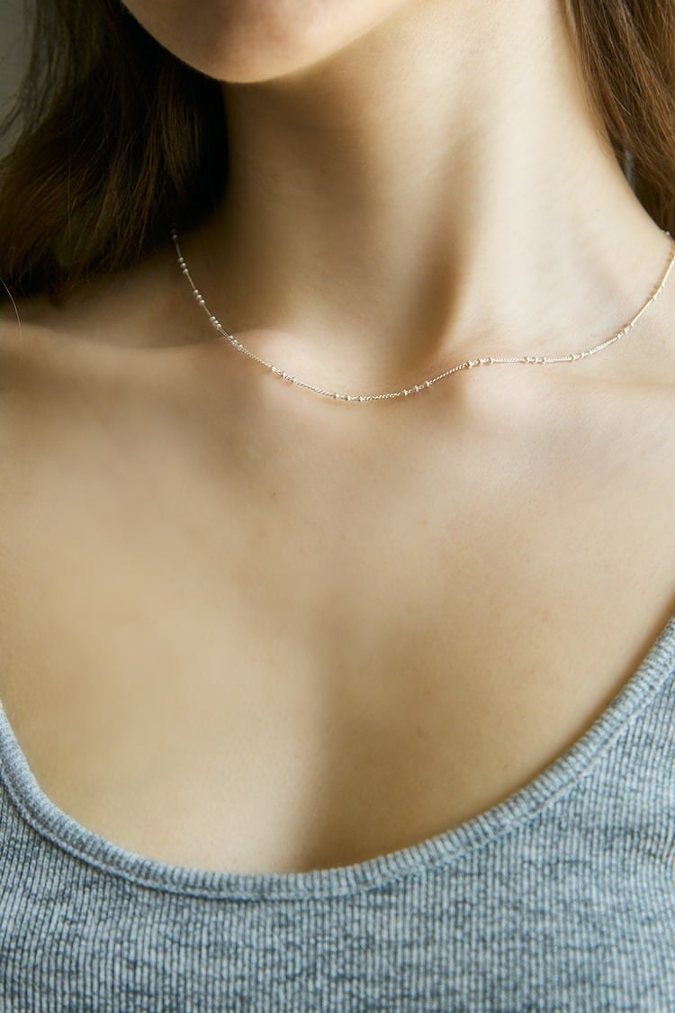 · 細いシルバーチェーンと小さな3つのボールがつながったディテールでポイントを与えたプレクルトリプルネッククリス。