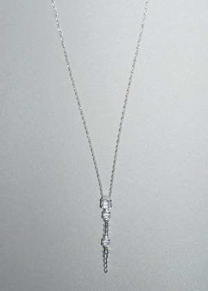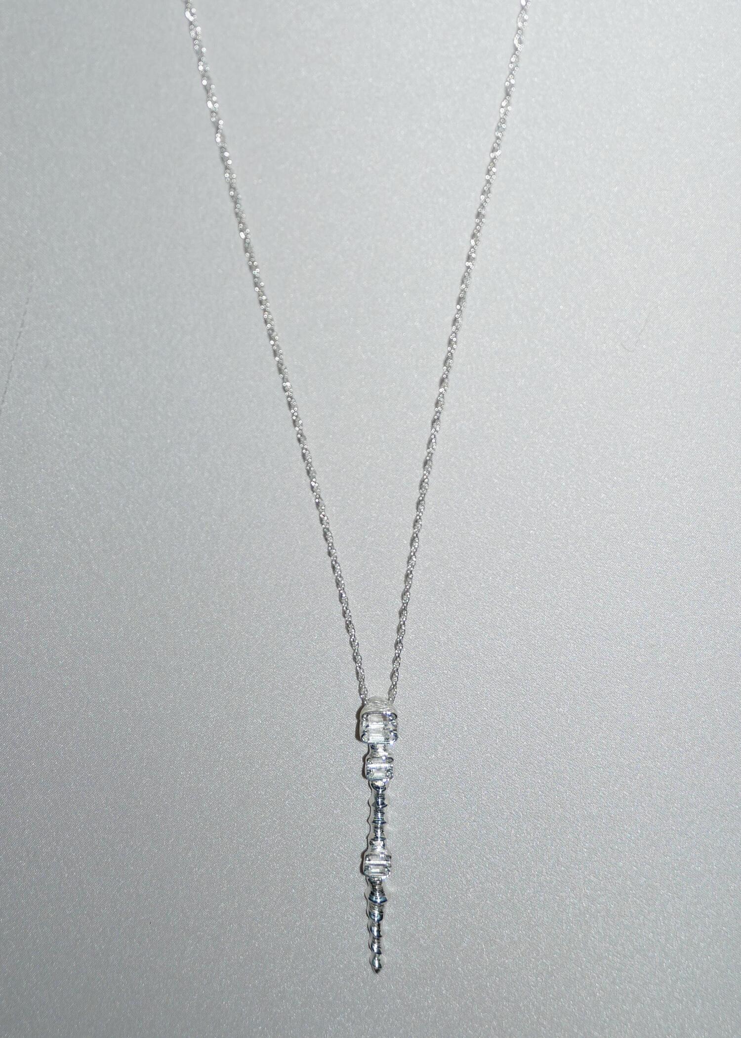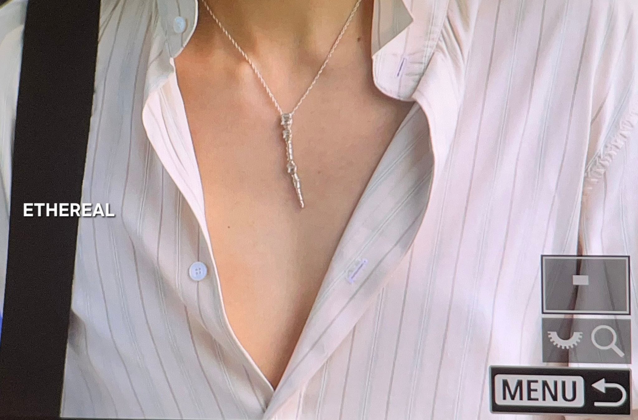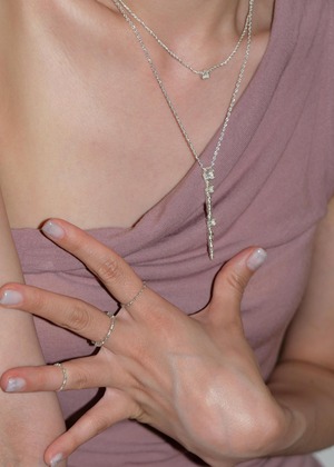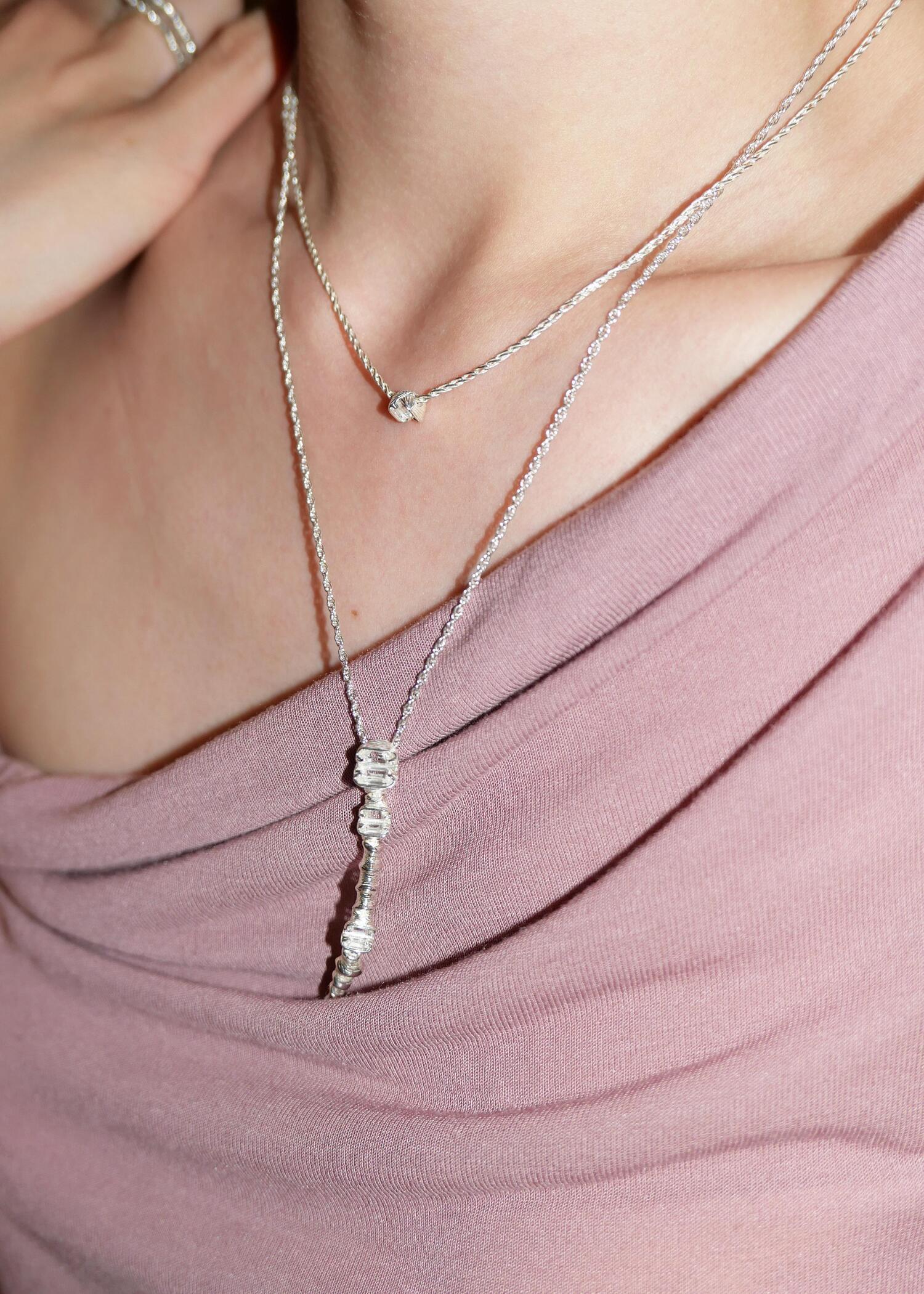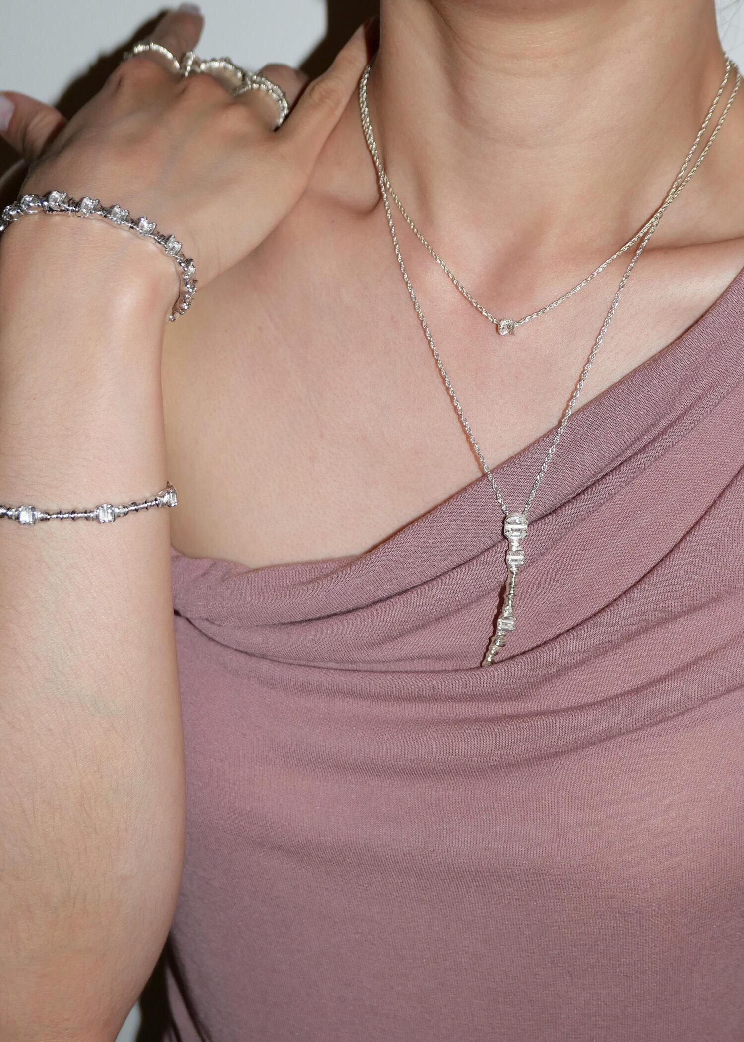 オリックスの対称的な角からインスピレーションを受けた形と繊細な質感に、軽い動きを加えたペンダントが引き立つネクリス