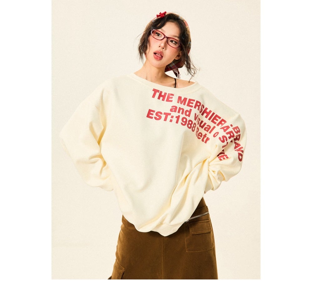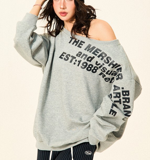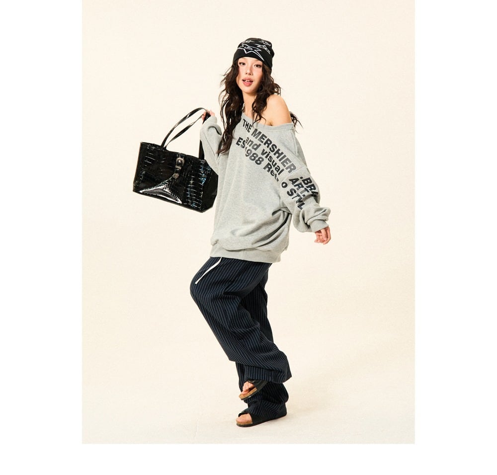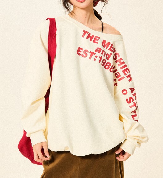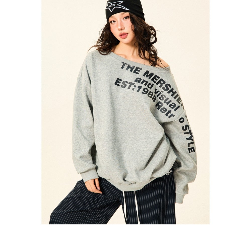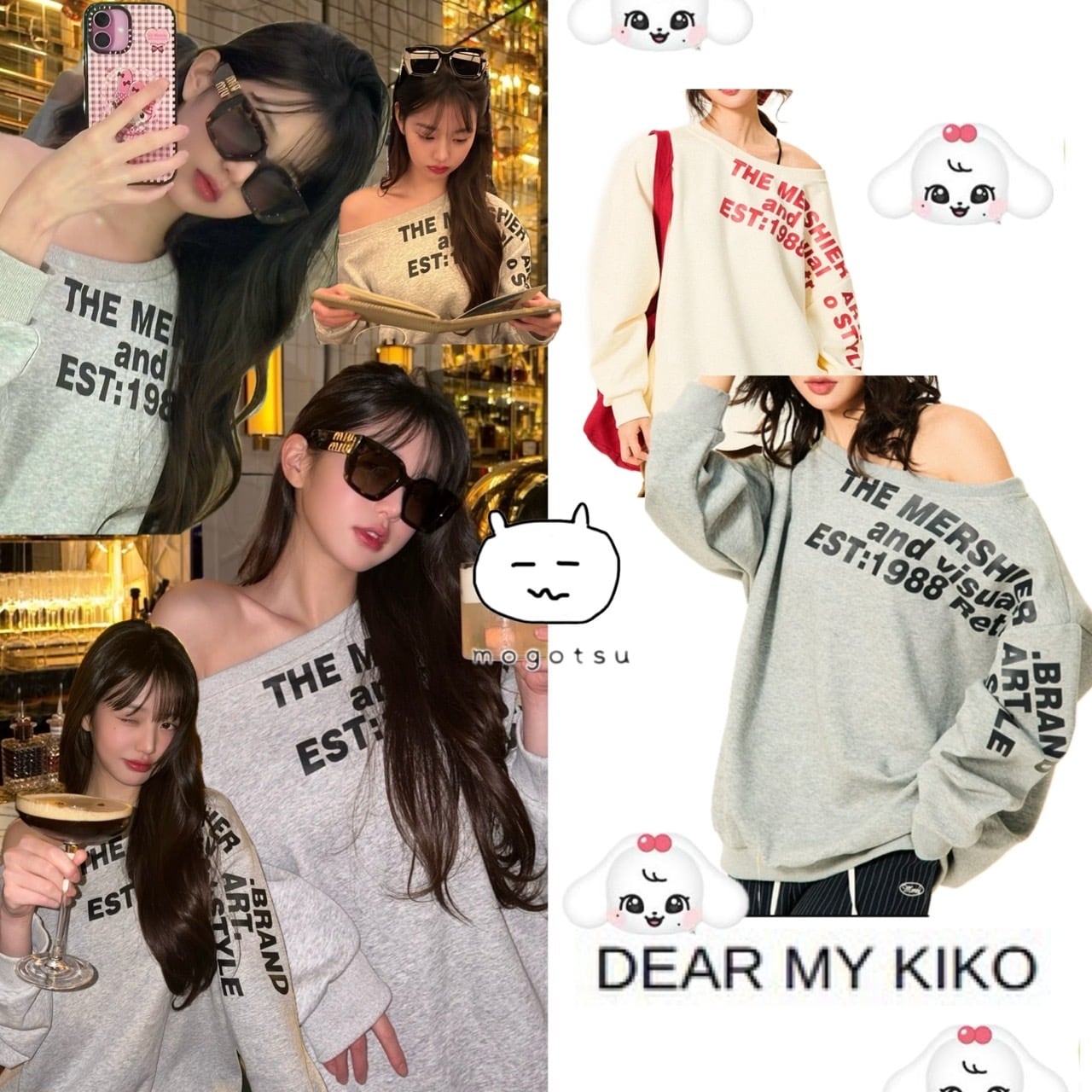 ★IVE ウォニョン 着用!!【DEAR MY KIKO】YOUNG STAGE Oblique Lettering Loose Off-shoulder Sweatshirt (2color)