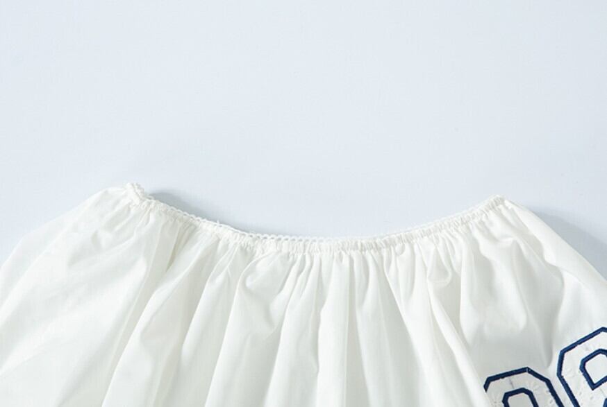 裾の「06」刺繍パッチがソフトなムードを加えています。