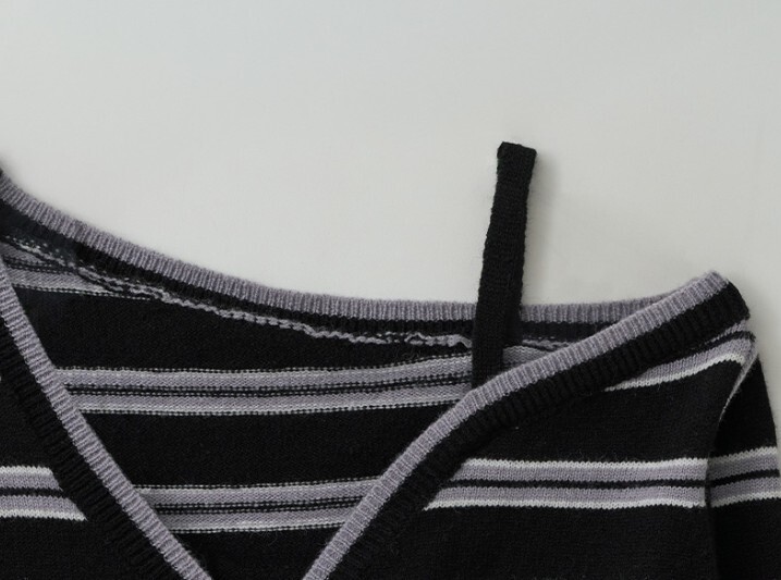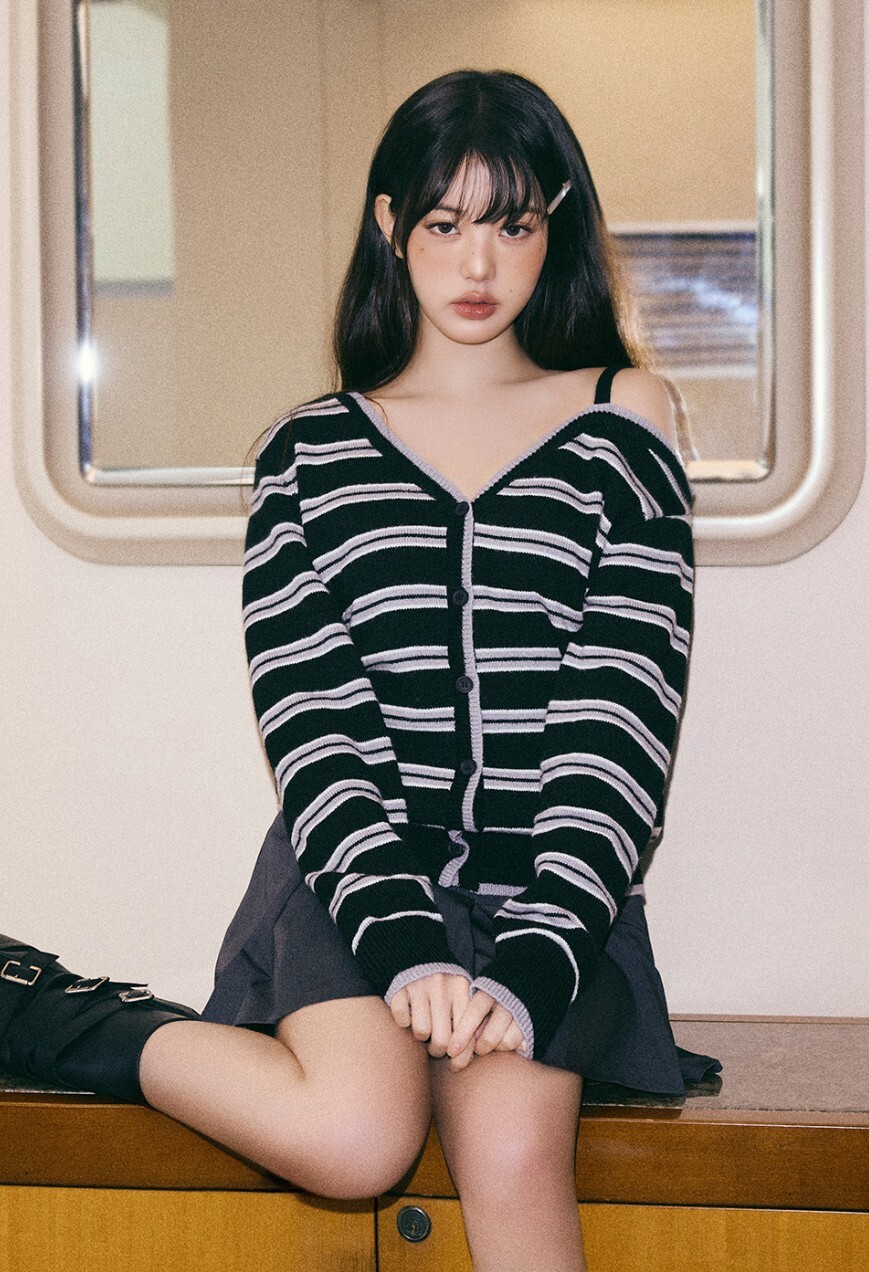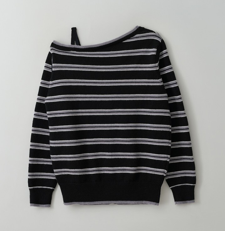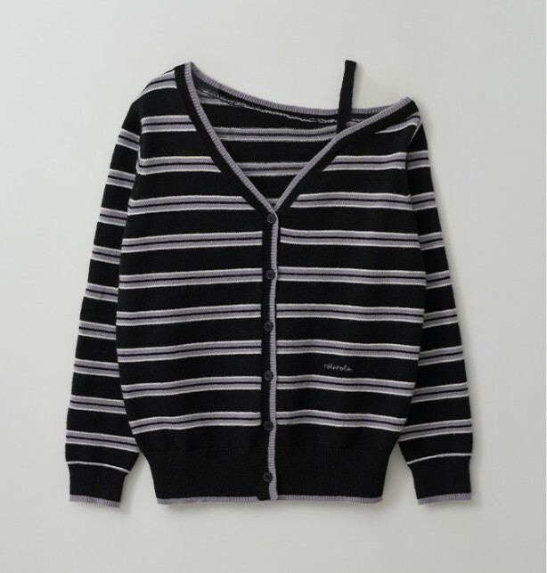 ☆rolarola人気商品最低価!!★IVE ウォニョン 着用!!【rolarola】ONE OFF SHOULDER STRIPE WOOL BLENDED CARDIGAN BLACK