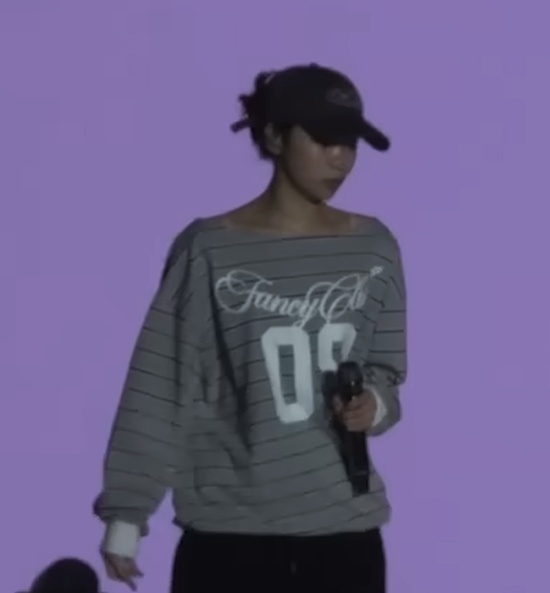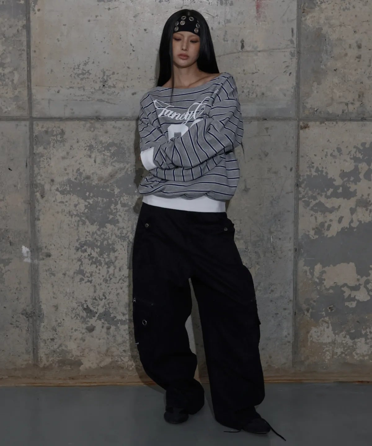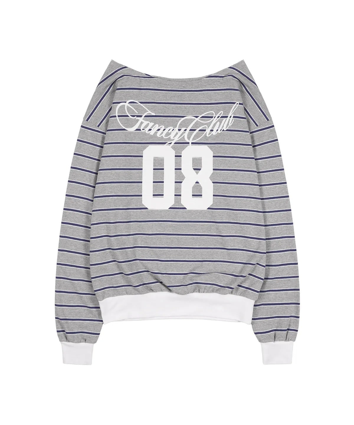 ★LE SSERAFIM チェウォン 着用!!【FANCY CLUB】Stripe One Shoulder Sweatshirt (GRAY)