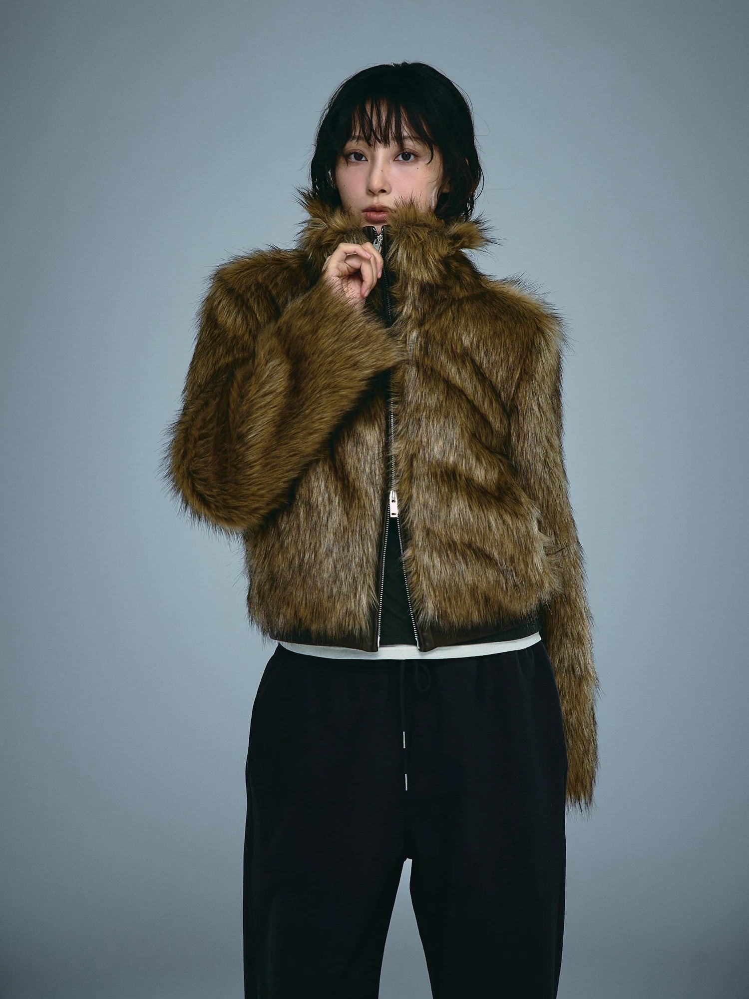 ワイドなファーの質感がポイントのブルゾンです。