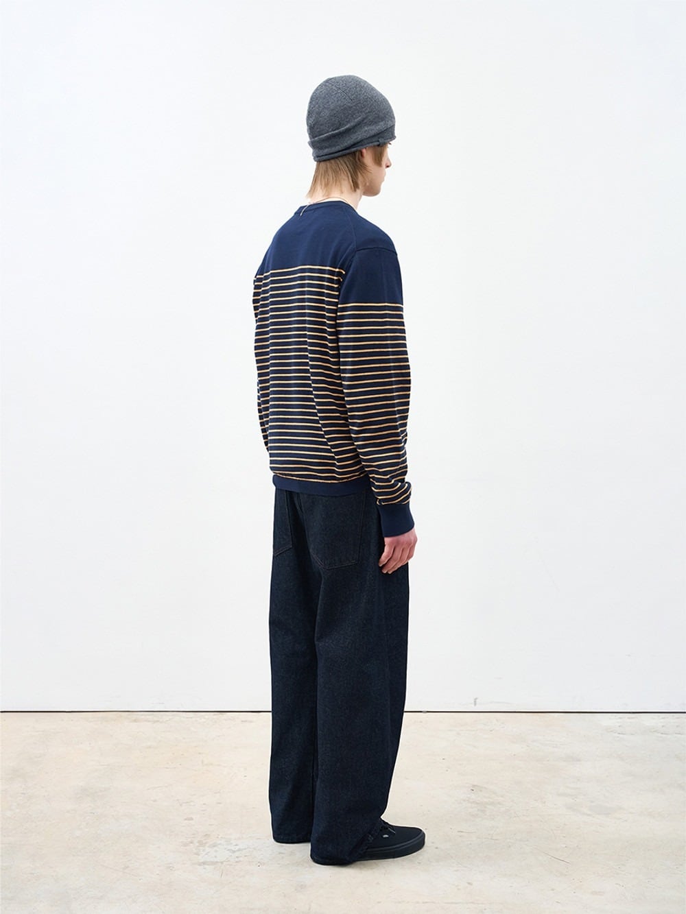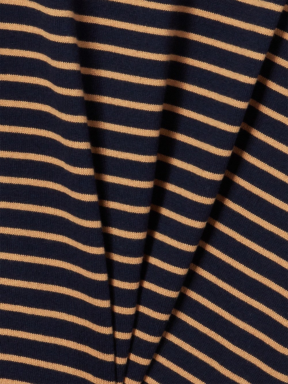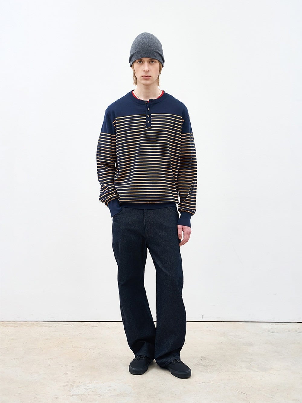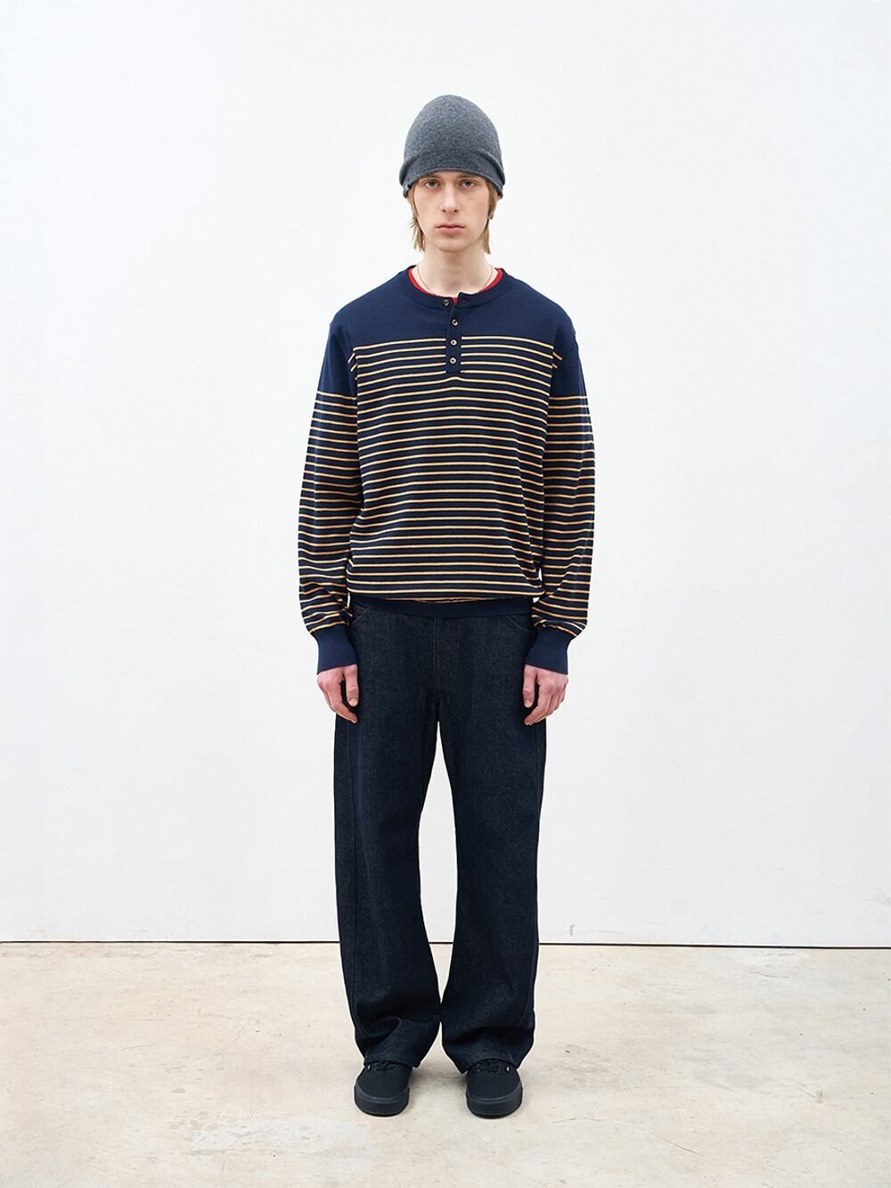 シーズンを重ねて完成度を高めたストライプヘンリーネックニット。 優れた保温性と通気性を兼ね備えたウールブレンドコットン糸の快適な手触り。 14ゲージ1本編みで実現した、オールシーズン対応の軽量テクスチャー。単品でもインナーとしても柔軟に使える、精巧なレギュラーシルエット。 ブランドロゴが刻まれた真珠母ボタンの控えめな光沢がもたらす、抑制されたディテール。 日常の格調を高める、タイムレスなムードのエッセンシャルピース。
