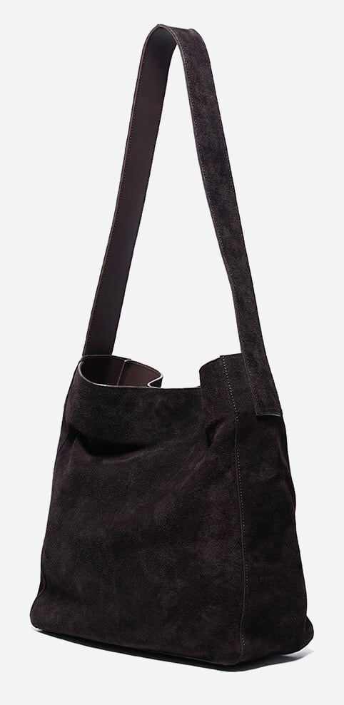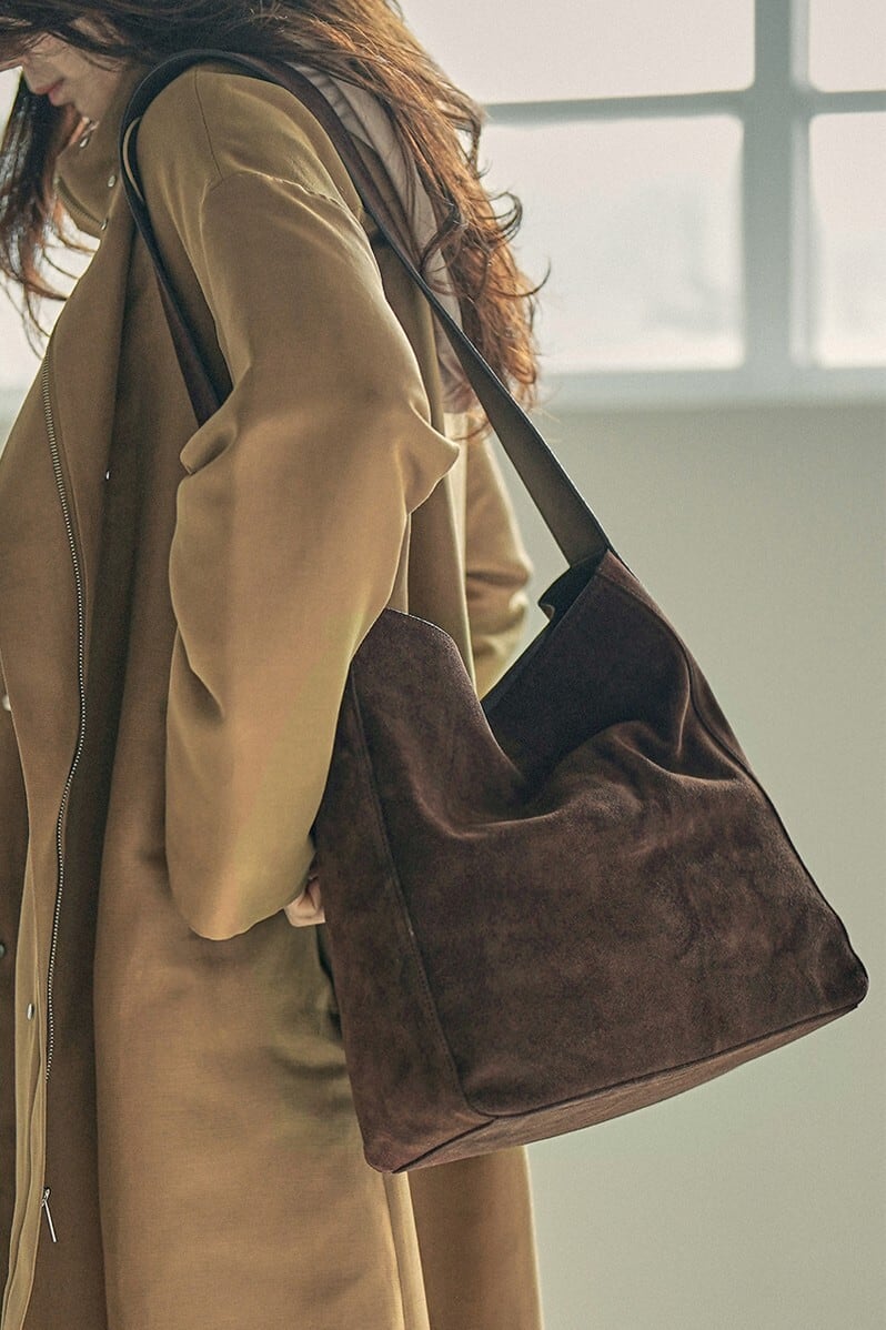 肩のハンドルは牛革とスエードがレイヤードされ、スエードバッグの不便さを補いました。