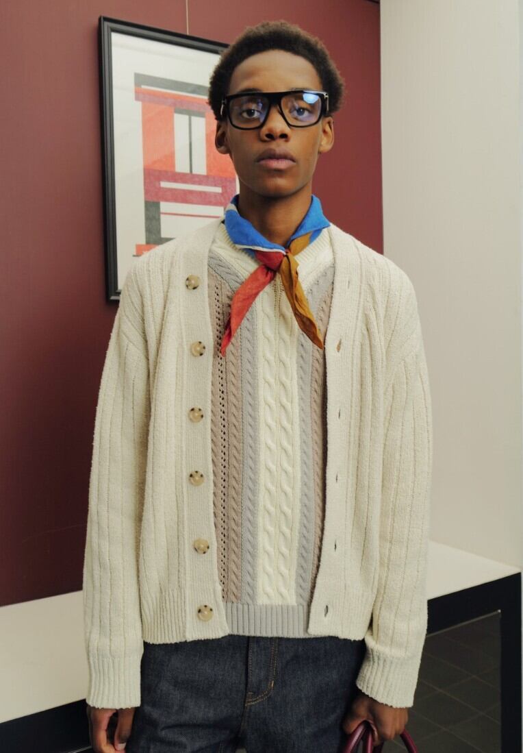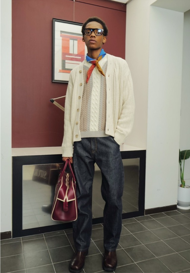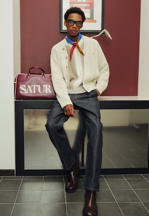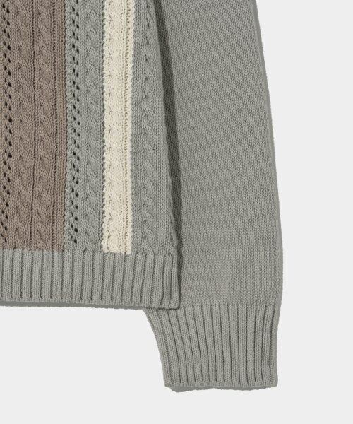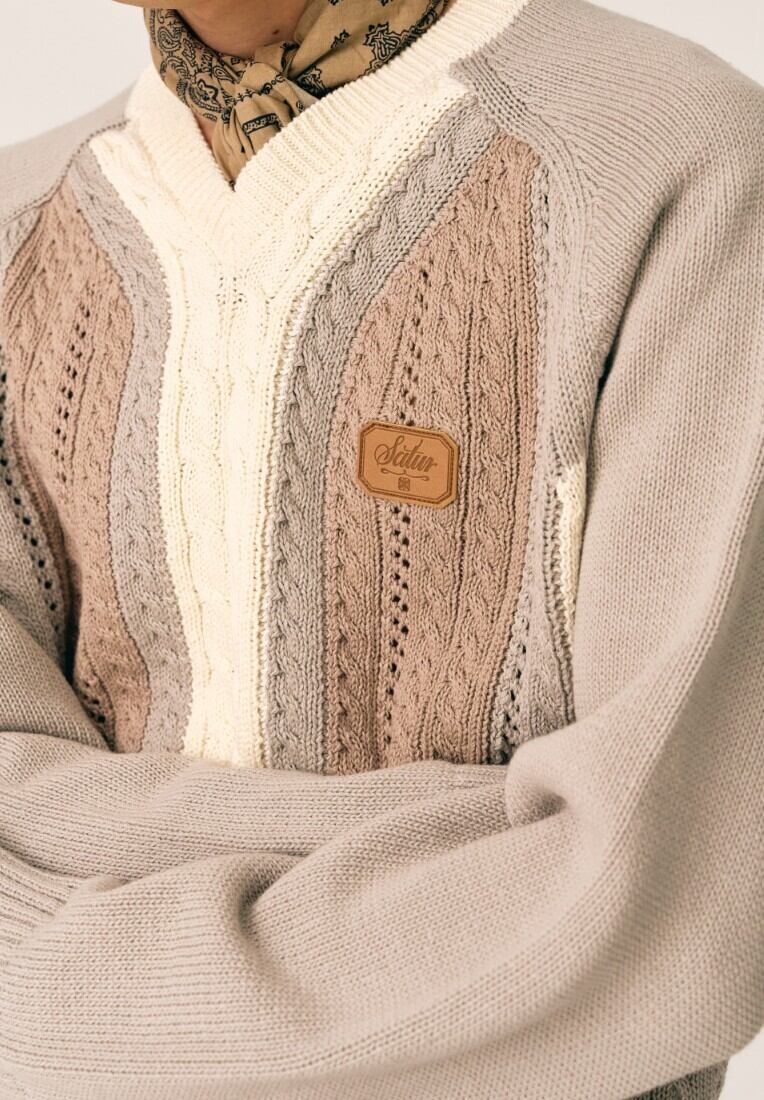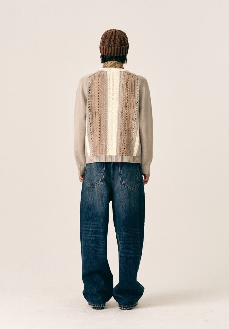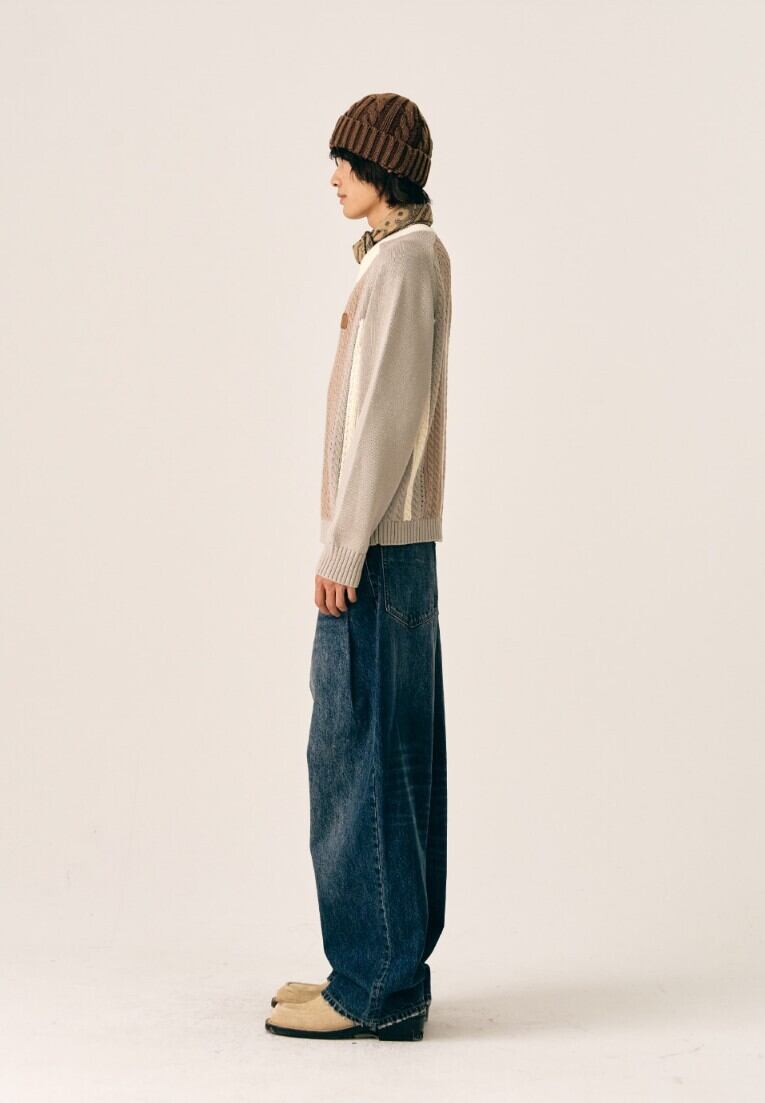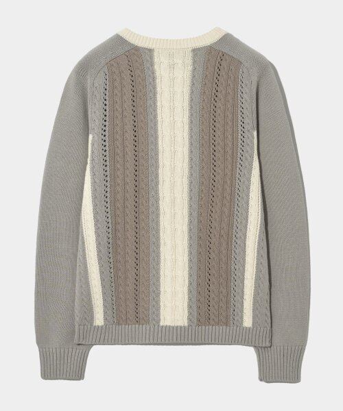 ケーブル編みと調和したカラー配色が魅力的なケーブルニットです。