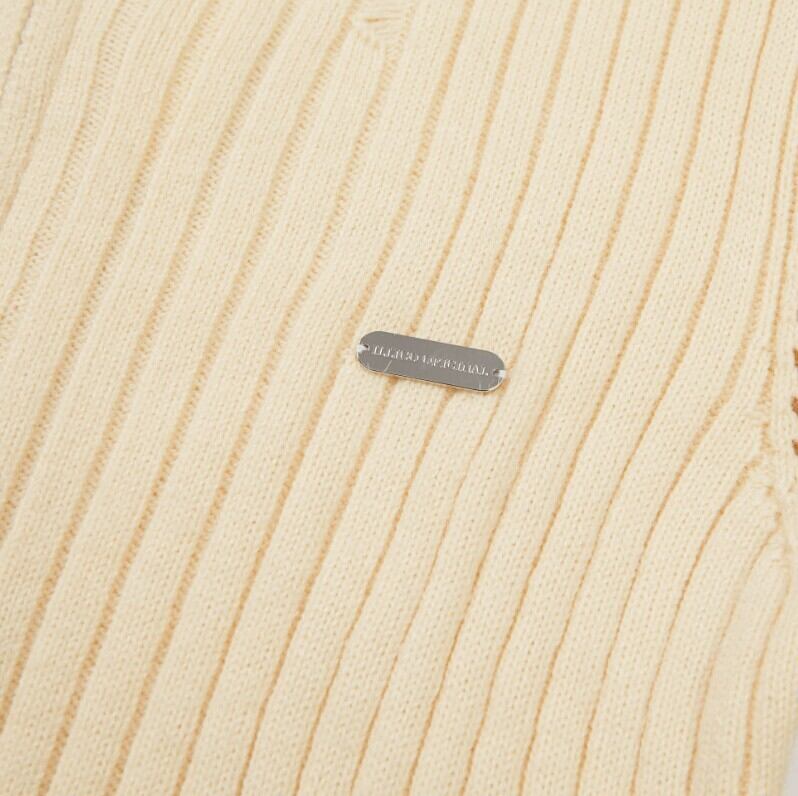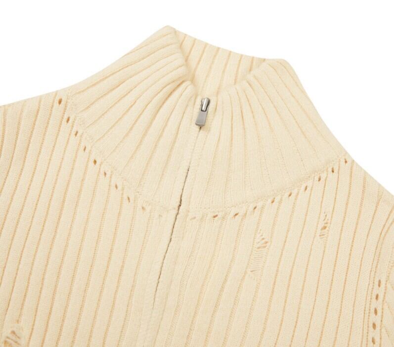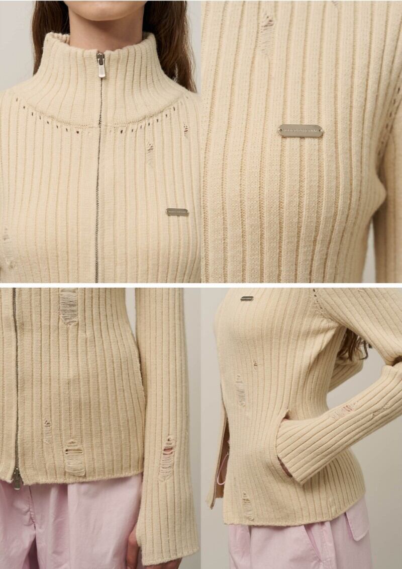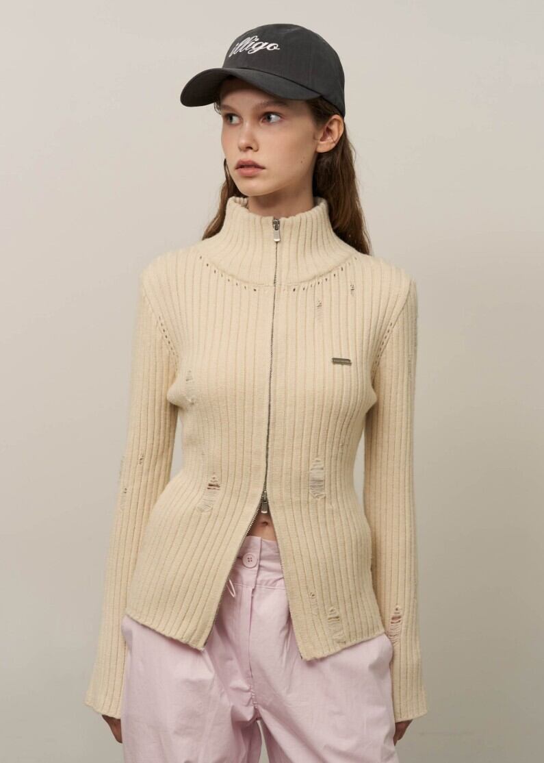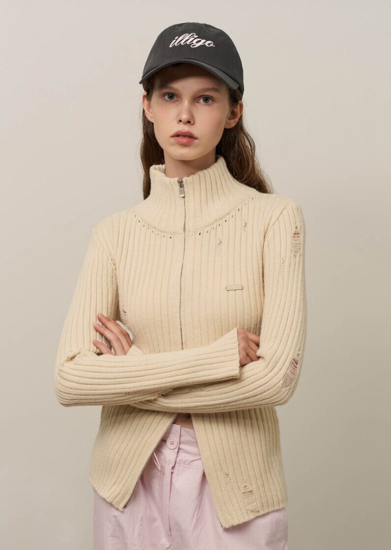★IVE アンユジン 着用!!【illigo】PUNCHING DAMAGE KNIT ZIP-UP CREAM