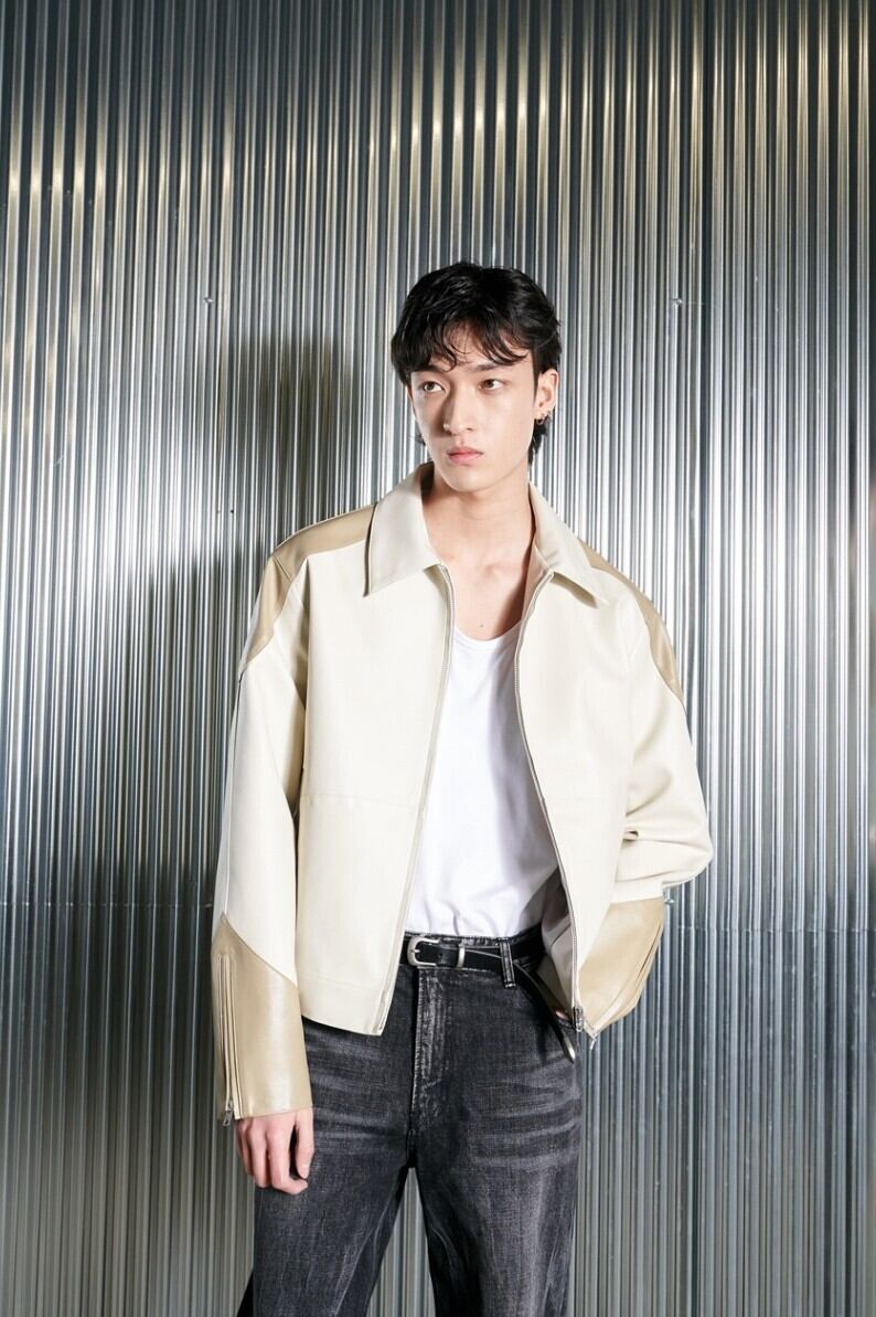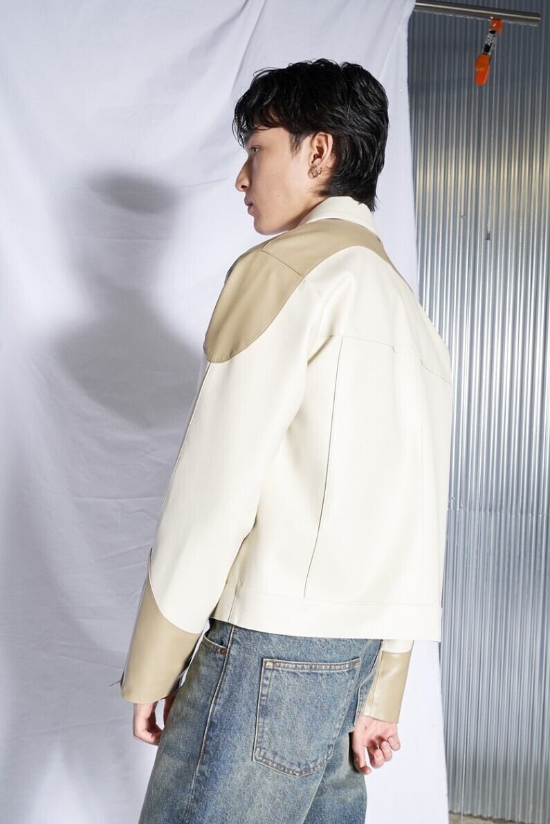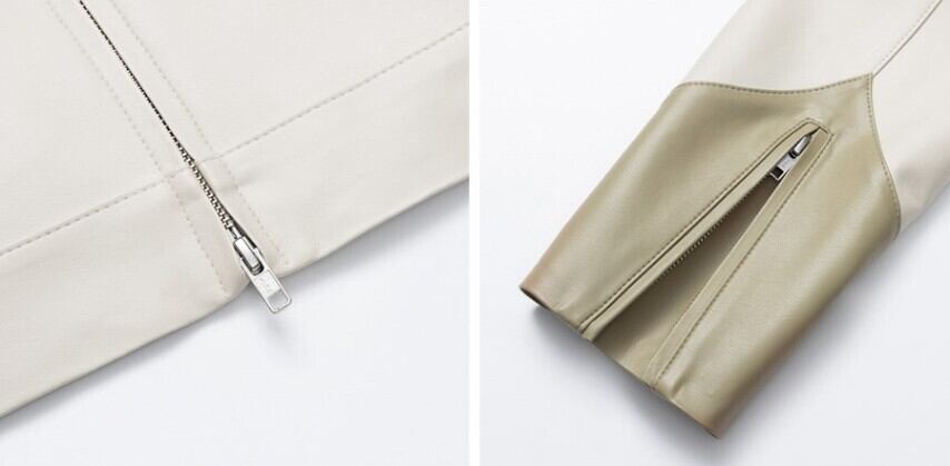 ビーガンレザーレーサージャケット、クリームとベージュカラーを活用して