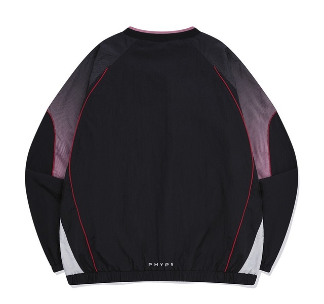 スムーズに流れるナイロン素材とカラーブロック、網点パターンで