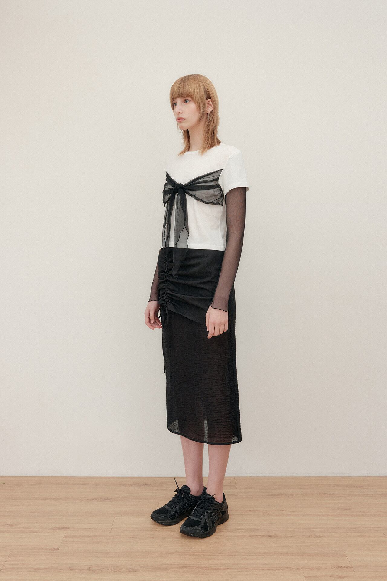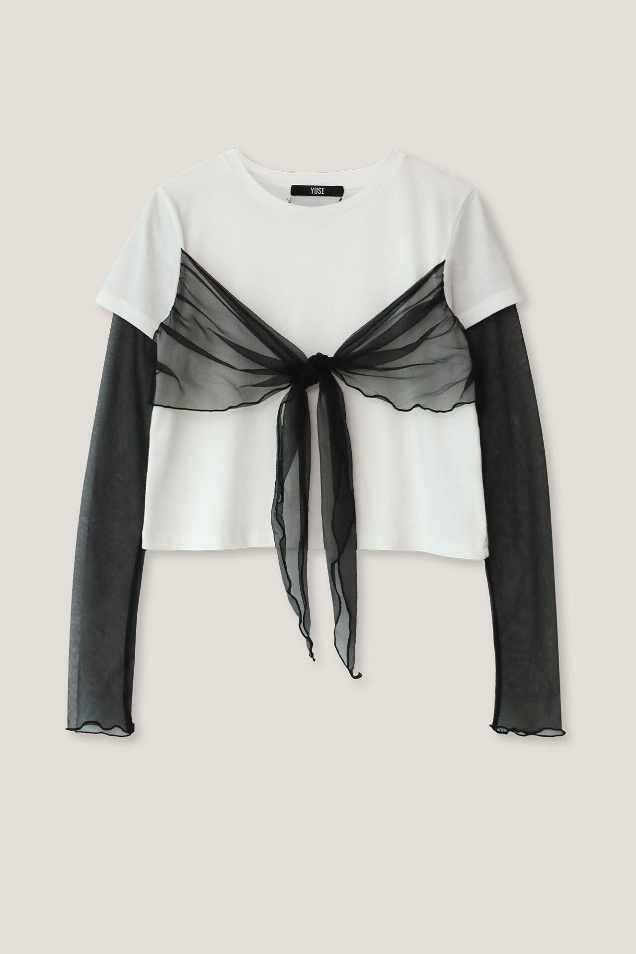 ★AESPA ニンニン 着用!!【YUSE】MESH RIBBON LAYERED T-SHIRT - IVORY/BLACK