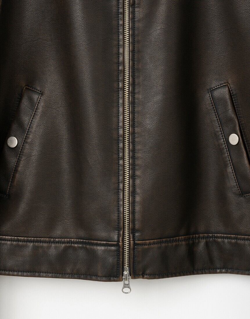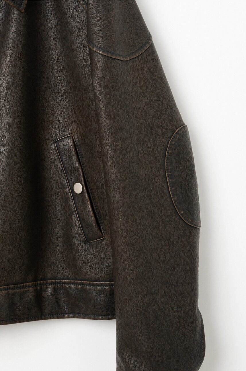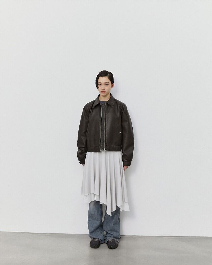 · ショルダーの切開ラインが強調されたビーガンレザージップアップジャケット