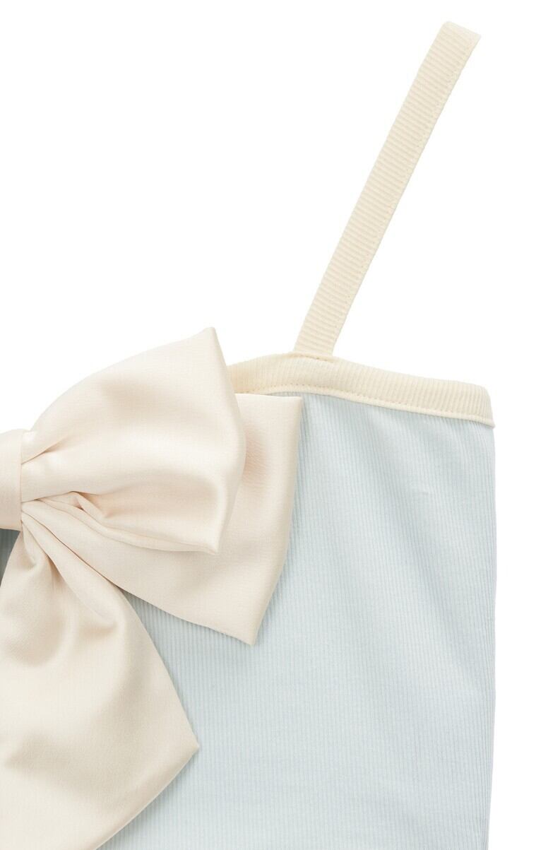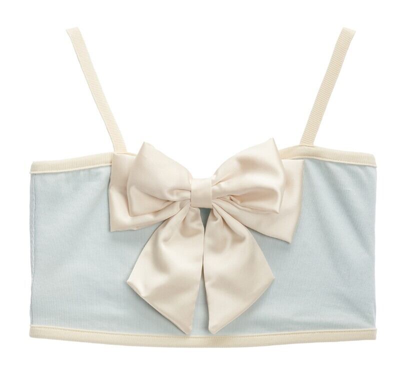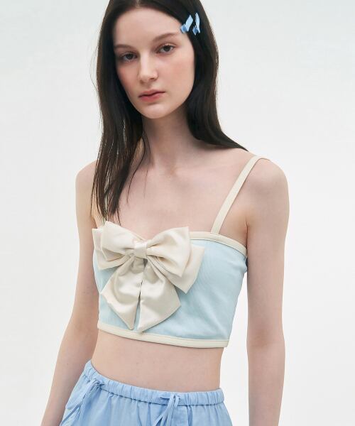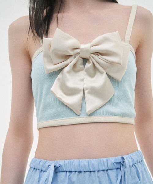 リボンとカラー配色が目立つ可愛さ、フェミニンさすべて盛り込んだクロップドノースリーブトップです。