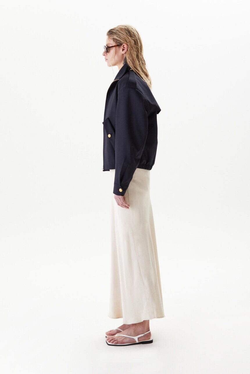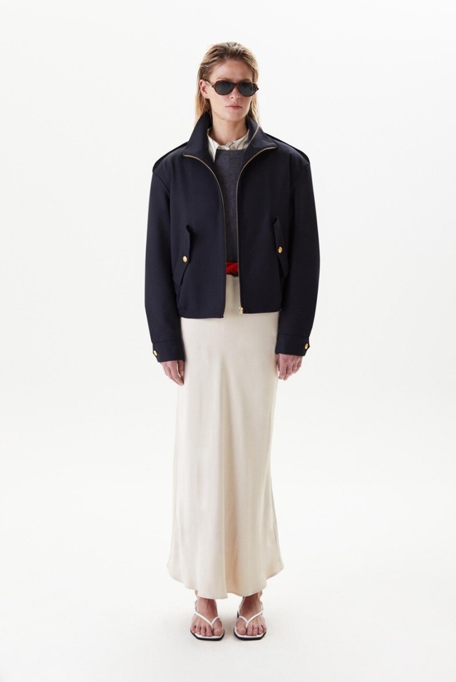 繊細な密度の消耗ウール混紡素材で製作されたオフィサーブルゾンです。 スイングジャケット、ハリントンジャケットの典型にオフィサールックのディテールを加え再解釈した現代的デザインで感覚的なシルエットと活用度の高いディテールが特徴です。 ボリュームのある肩とオーバーサイズフィット、テーラード袖はエレガントなドレープを演出し、アンブレラヨークおよび肩章、ゴールドボタンなどオリジナルディテール要素をバランスよく配置しました。 装飾された24K純金メッキボタンは、洗練されたルックの完成度を高めます。