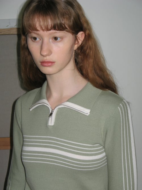 [SINOON] LINE HALF ZIP-UP KNIT TOP (LIGHT KHAKI)