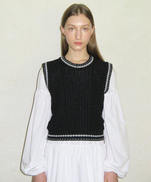 [SINOON] CROP RIBBON KNIT VEST (BLACK)