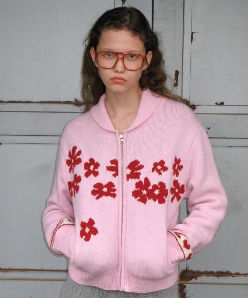 [SINOON] FLOWER KNIT ZIP-UP (PINK)