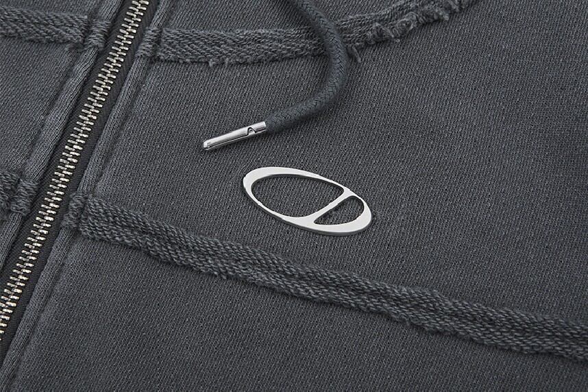 左胸にシグネチャーロゴの金属装飾でポイントをつけたカットオフフードジップアップです。