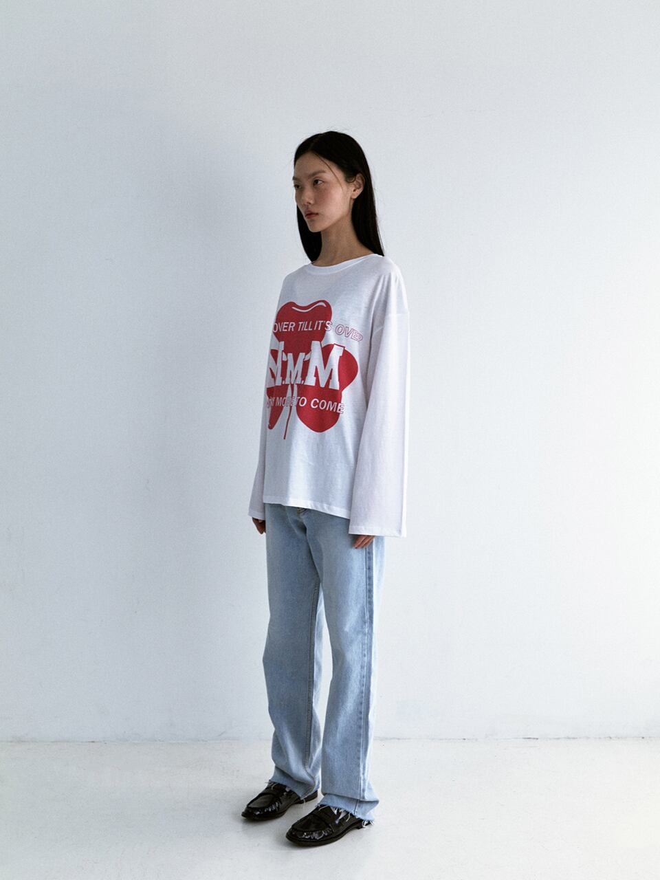 MMMのロゴを幸運を象徴するクローバーで表現したプリントTシャツで、ゆったりとしたサイズと丈感の長袖Tシャツです。