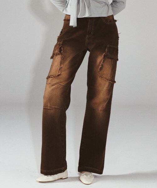 [PRENDA] FRAYED POCKET DENIM PANTS DARK BROWN