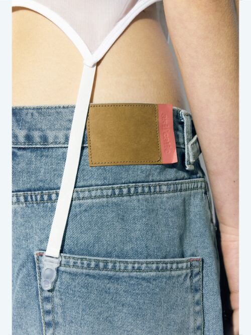ワイドなシルエットのデニムパンツで、ウエストにはサイズ調節のためのベルトディテールがあります。