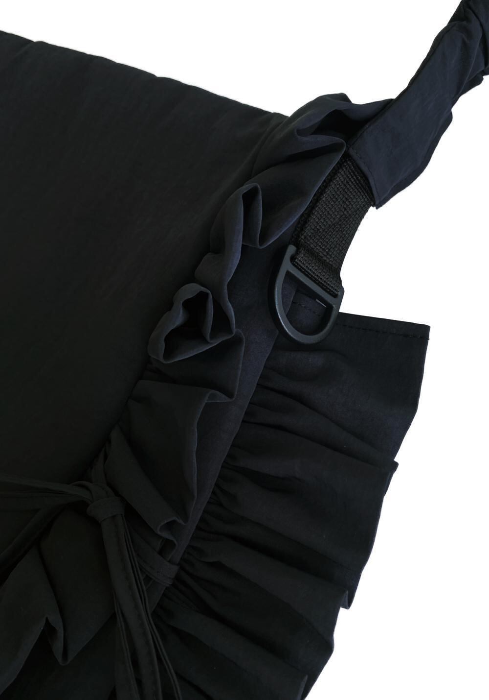 ワッシャーナイロン生地で製作されたオーバーサイズラッフルクロスバッグです。 紐が調節できるのでクロス、ショルダーバッグで演出できます。 右側にキーリングを接続できるD-RINGが付いていて、内側に収納を分けられるスペースがあります。