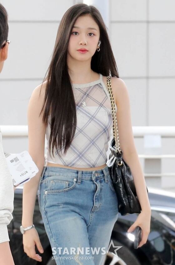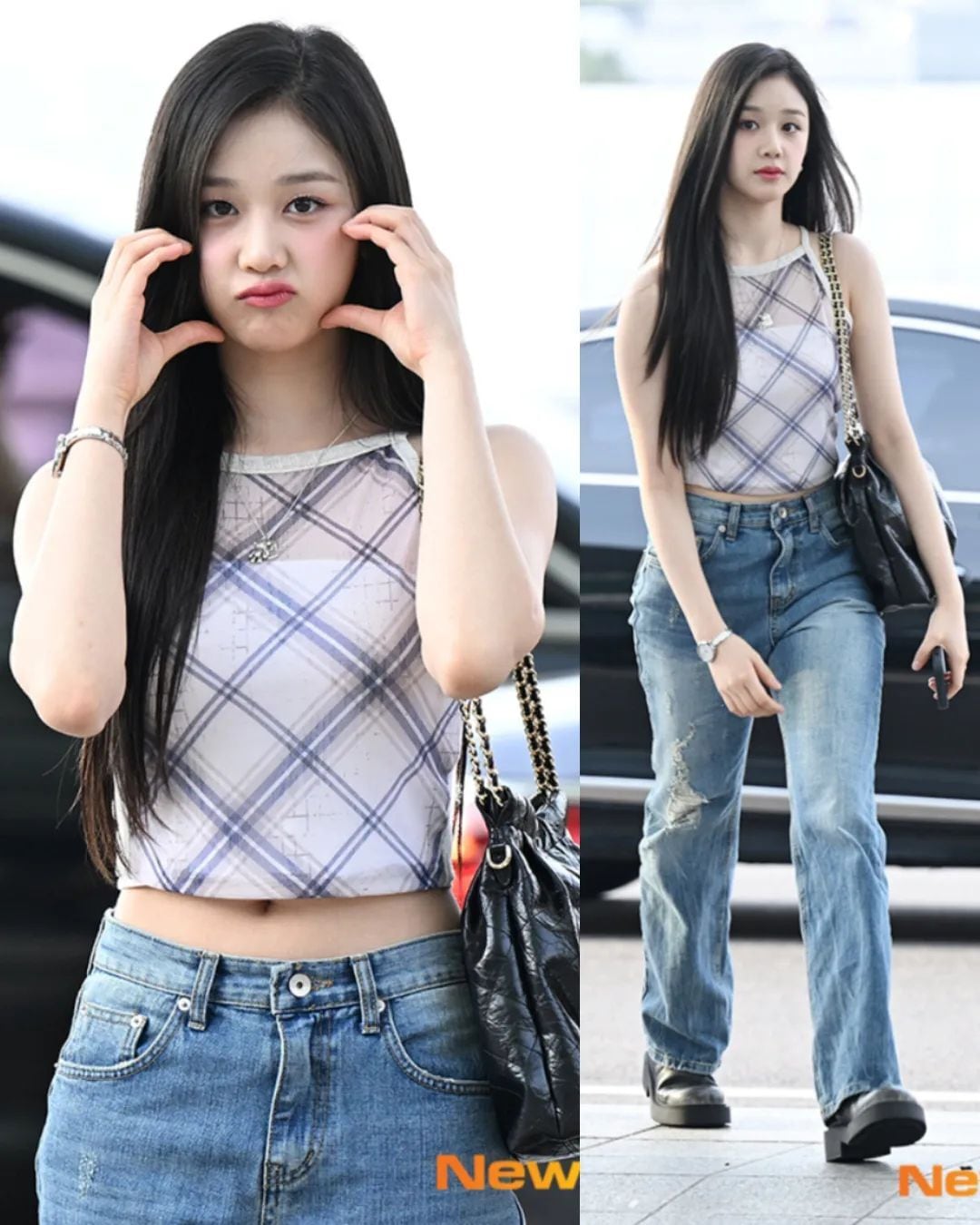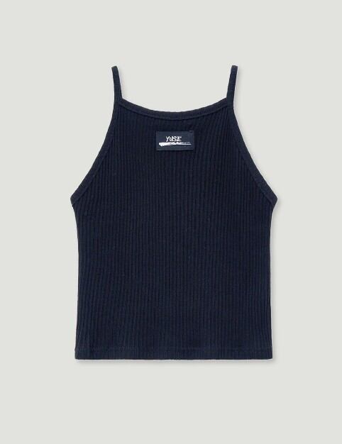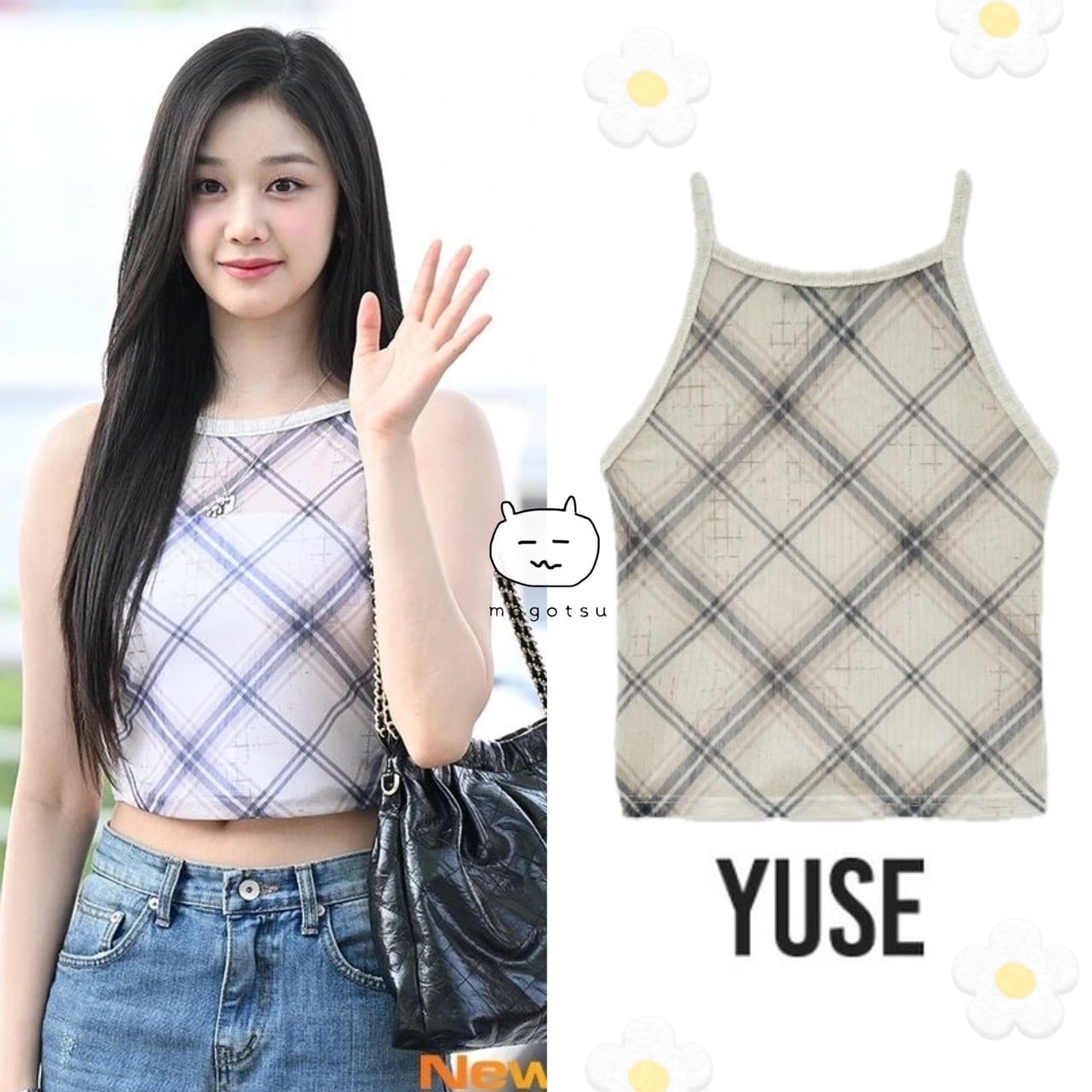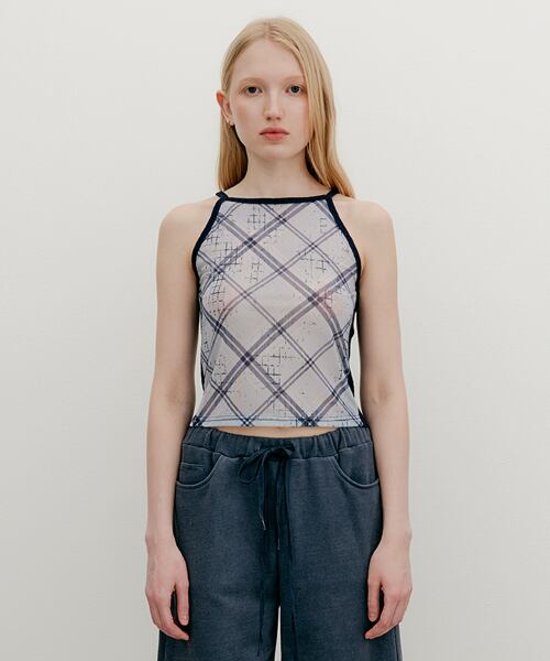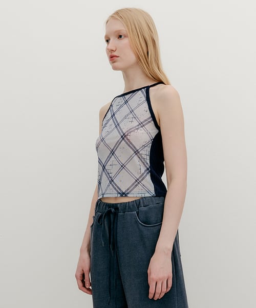 ★BABYMONSTER ファリタ 着用!!【YUSE】CHECK PRINTED KNIT MIX HALTER TOP - NAVY
