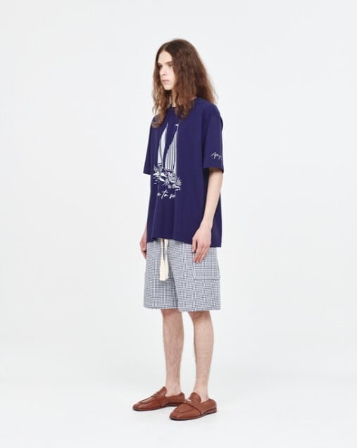コレクションテーマのモチーフが引き立つプリントTシャツ。 バイオウォッシングを経たしっかりとした肌触りの高密度16番手シングルコットンファブリック。 デンタ加工と茂みウォッシングによる生地の収縮と変形を最小限に抑え、ナチュラルなシルエットを表現。 袖単作のレタリングロゴ刺繍ディテール。 ゆったりとした多彩な感覚を与えてくれるアイテム。