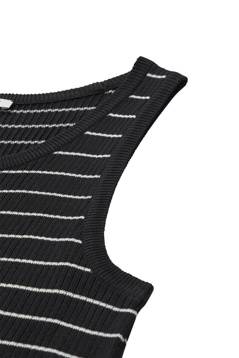 柔らかいテクスチャーのニットストライプスリーブレスアイテムです。