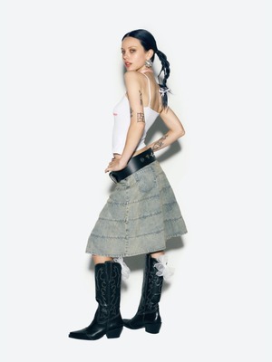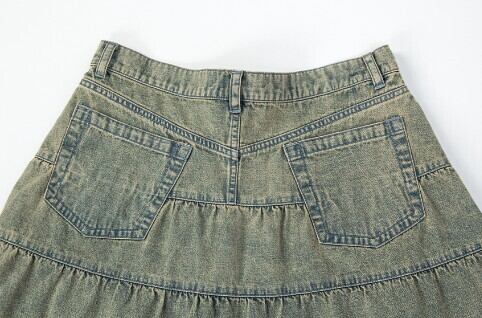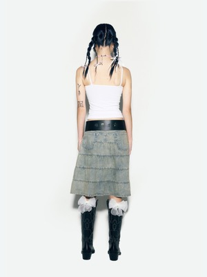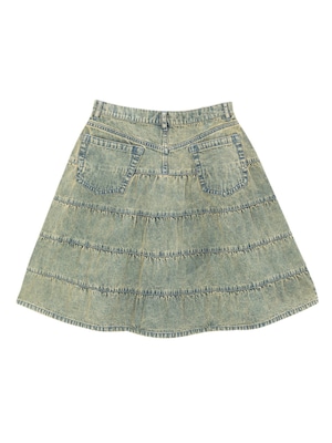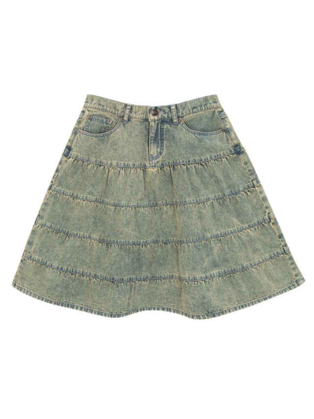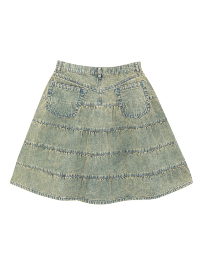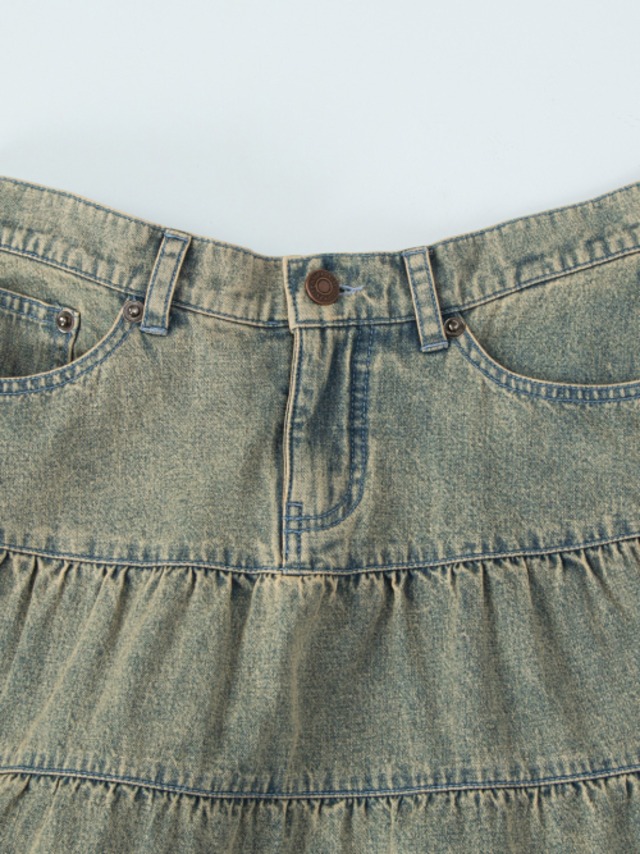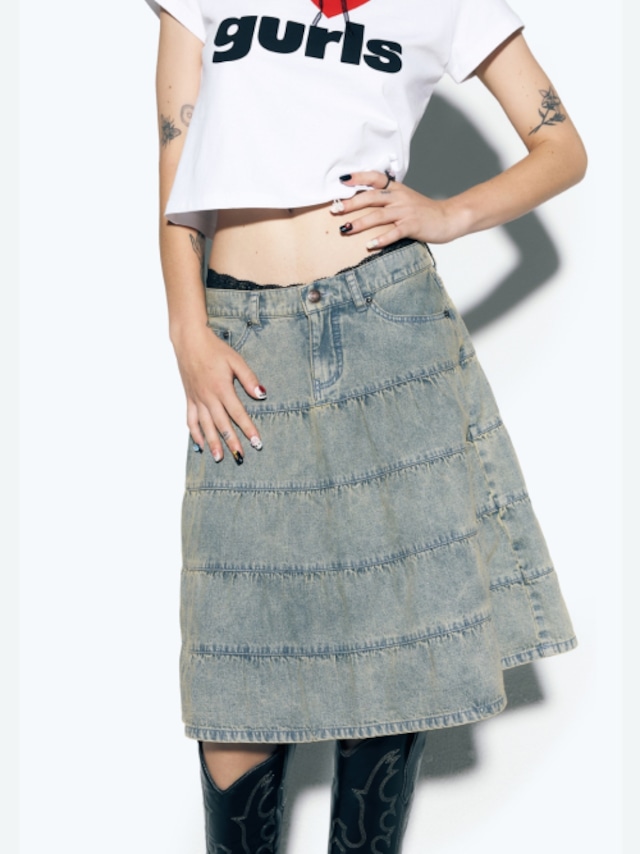 レトロなムードを盛り込んだローライズシルエットのミディアム丈感を持つティアードデニムスカートです。