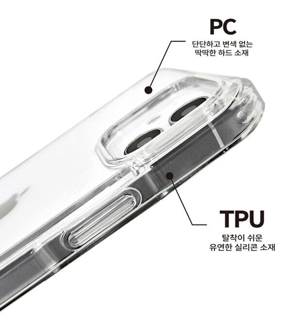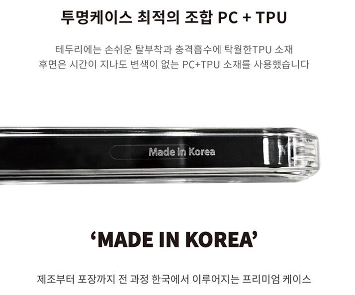 デザインと安定性を兼ね備えた 今まで見たことのない新しいバンパーゼリー ミリタリー·グレード ドロップテスト通過完了 米軍軍用規格ミリタリーグレードのドロップテストは、1.2Mの高さで 26番落下時に異常がないと適合判定を受けることができません PC 丈夫で変色のない 硬いハード素材 TPU 着脱が容易な 柔軟なシリコン素材 透明ケース 最適な組み合わせ PC + TPU 枠には簡単な脱着と衝撃吸収に優れたTPU素材 背面は時間が経っても変色しないPC+TPU素材を使用しました 'MADE IN KOREA' 製造から包装まで全ての過程で韓国で行われるプレミアムケース カメラ保護 平板の厚さがカメラホールより高い カメラが飛び出る心配もなく イージーボタン ボタン部 ディテール向上で 小さな力でも柔らかく楽なボタン感 液晶保護 角のエアポケットは液晶より高く 液晶割れ防止 ZERO