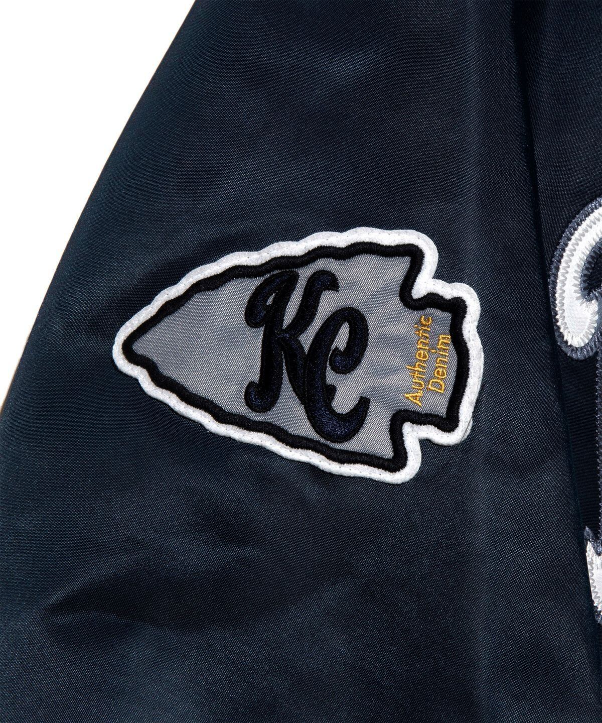 前板のオールドスクールKansas Cityレタリングが特徴のバーシティージャンパーです。